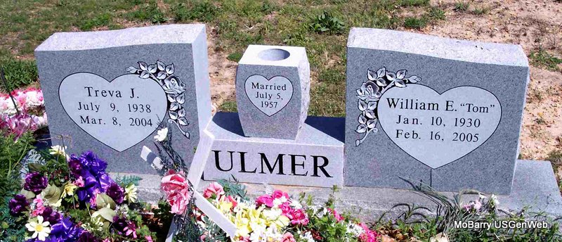 | ULMER, William E. "Tom" | Jan. 10, 1930 | Feb. 16, 2005 | SSW: Treva J. - Inscription: "Married July 5, 1957" - Research Note: Twin to George Elburn Ulmer. He was the son of Clarence and Eula (Hankins) Ulmer. | Brother's Obit Phyllis Long Photo Diana Cope |