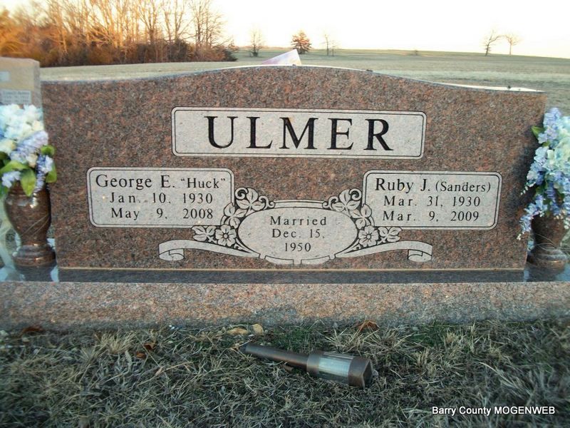 Mar. 9, 2009 | SSW: George E. "Huck" - Inscription: "Married Dec. 15, 1950" - Research Note: According to the Monett Times obit she was a daughter of James E. and Bessie (Brock) Sanders. She was a member of Cherokee Nation West. She married George E. "Huck" Ulmer on Dec. 15, 1950, in Eureka Springs, AR, and he preceded her in death in May of 2008. She was preceded in death by five brothers, Bill Sanders, Carl Sanders, Ralph Sanders, Paul Sanders and Danny Sanders; and three sisters, Pauline Baker, Shirley Betts and Dorothy Case. | Monett Times Jay Trace Photo Diana Cope |