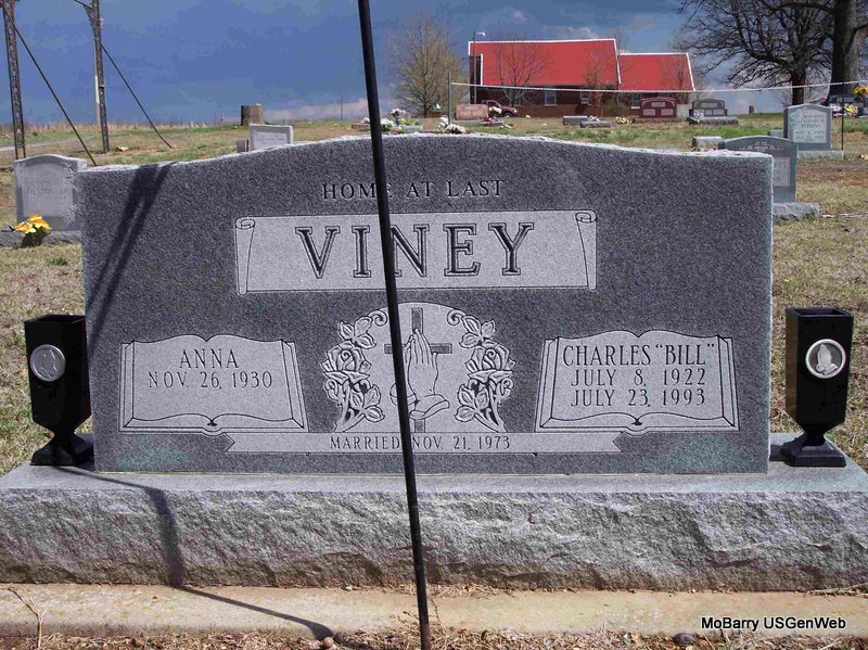 SSW: Charles "Bill" - Inscription: "Married Nov. 21, 1973" - Research Note: She was the daughter of Roy and Lola (Brown) Bradley. On November 21, 1973 in Miami, Oklahoma she was united in marriage to Bill Viney, who preceded her in death on July 23, 1993. Also preceding her in death were her parents and two sisters, Wilma Buchannan and Mary Lynn Tucker. Anna Mae grew up and attended school in Butterfield, Missouri. After her marriage to Bill, they moved to Rogers, Arkansas before returning to Butterfield. | Fohn Funeral Home Phyllis Long |