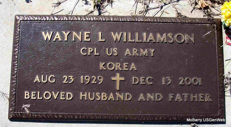 SSW: Ollie M. Perkins - Research Note: He resided in Butterfield, MO at the time of his death. He was the son of Ermal and Minnie Mae (Easley) Williamson. He was an Army veteran, played in the Ozarks Ramblers Band in Cassville in the 1950s, and played baseball in the Babe Ruth League in Cassville. He retired as production inspector with Ford Motor Company in Richmond in 1990. He was a past mayor of Butterfield and had also been association with Williamson Funeral Home in Cassville. He married Ollie Perkins on December 26, 1951. He was preceded in death by his father, Ermal Williamson. - Another Stone - "CPL US ARMY KOREA - BELOVED HUSBAND AND FATHER" | Obituary Frank A. Williamson Monett Times Phyllis Long Photo Diana Cope |
