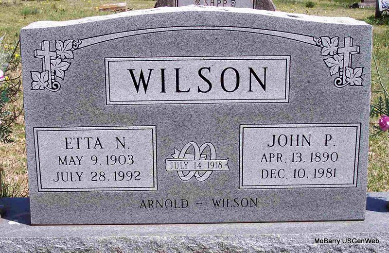 SSW: John P. - Inscription: "Married July 14, 1918" - Research Note: Daughter of William M. Arnold and Mary T. Johnson. Obit - Carthage, Mo. - Etta Naomi Wilson, 89, Carthage, a former Joplin and Sarcoxie resident, died at 7:49 pm Tuesday at a Carthage nursing home after a long illness. Mrs. Wilson was born May 9, 1903, at Cassville. She lived in Sarcoxie from 1933 to 1979 and in Joplin from 1979 to 1983. She was a member of Immanuel Lutheran Church. She married John P. Wilson on July 14, 1918, at Butterfield. He died Dec. 10, 1981. Survivors include a daughter, two sons, six grandchildren, 11 great grandchildren and two great great grandchildren. Graveside services will be at 2 pm Friday at Mount Pleasant Cemetery, near Butterfield. The Rev. James Schnakenberg will officiate. Arrangements are under the direction of Parker Mortuary, Joplin. | Online Obit SS Claims Index Phyllis Long Photo Diana Cope |