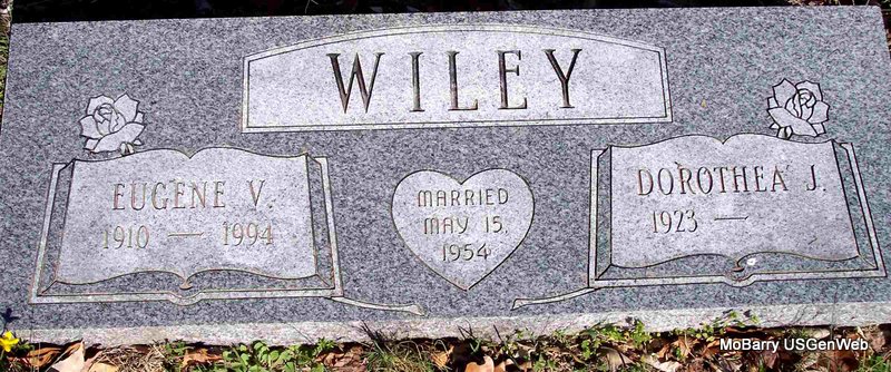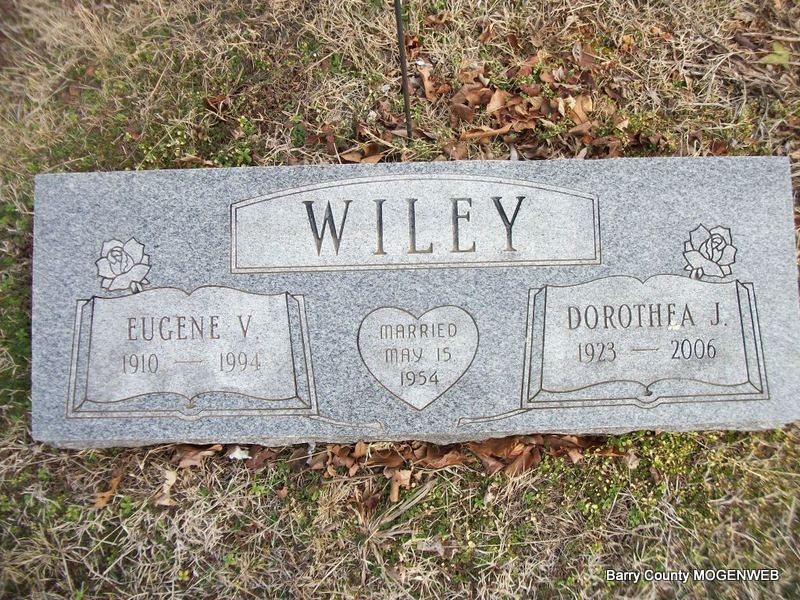 SSW: Dorothea J. - Inscription: "Married May 15, 1954" - Research Note: Purdy, MO resident. He was the son of William Marion Wiley and Sarah Elizabeth Kinsel. He married Dorothea Johnson on May 15, 1954, at Las Vegas, Nev. He was a retired farmer. He moved to Purdy from the state of California in 1969. Survived by 2 sons and five daughters, 20 grandchildren; and 16 great-grandchildren. - Bio at findagrave.com by David Osterman - Unknown author. Provided by Judy Wyant.: Eugene (Gene) Wiley was born July 12, 1910, in Falls County, [near] Lorena, Texas (Rt. 3) – The 13th child of William M. and Elizabeth S. Wiley. When he was born, his sister Viola (Vi) was still living at home – the others were married or deceased. He attended school in Memphis, Texas and finished the 9th grade at a school in Huntington Beach, Calif. When Gene was a small boy, his older brother Alvin had a cafe in Clarendon, Texas, and one day Gene left home on foot to visit him. His Dad went after him on a white mule. Gene's mother saved him from getting a whipping, by reminding his dad that he had given Gene permission to go earlier. Gene liked to go to Alvin's because he was always fed hamburgers and pop. When Gene was 4 or 5 years old, his brother, Elmore decided to play a trick on him. At that time, Gene was very brave and not afraid of the dark, as some children are. Elmore went out to the cellar one night dressed in a white sheet. Gene went out to get a jar of jam for his mother and up popped a ghostly figure out of the dark cellar, uttering a low, spooky "Boo-oooo". Gene backed up and his hand brushed against a wrench that someone had left on the wall, and automatically clenched it in his fist. As the white apparition came out of the cellar at him, he let the "ghost" have on top of the head — knocking, it out cold. Gene ran into the house screaming to his mother that he had killed a ghost. His parents found Elmore unconscious. He recovered and never tried to scare Gene again. One Halloween night Gene started to the barn where his mother was milking, and before he got there, Vi and Ivy, came at him dressed in a white sheets with a lit pumpkin on their heads — he fainted. When the family moved to Childress, Texas, Gene rode to town to go to a spooky movie one night. Coming home, he passed the cemetery and saw a white thing rise up out of one of the graves. He galloped home and told Orville, then Vi's husband, that he had seen a ghost in the cemetery. Orville took him back to the cemetery and showed him the "ghost" —— an old white faced cow. When he was about nine years old, Gene finally stopped being afraid of the dark. By then, his folks had a boarding house in Childress, Texas. Viola and husband Orville, and a friend "Red" and his wife lived together, and Gene went to visit them quite often. He was afraid to go home alone because of the "things" behind the trees along the road, at night. His father finally, told him he couldn't go to Orville's, or to the movies until he got over his fear. He made Gene go down the road alone after dark, and go around each tree to prove to himself there were no "things" to be afraid of. It worked! The "Red" mentioned earlier had an airplane he used at Fairs to fly passengers around the area. Gene stowed away in the plane, without telling anyone. At the end of the flight, Gene came out of the cockpit so sick and shaken that he won't get into an airplane to this day! When Gene and Viola were children, she loved to tattle on him which usually resulted in a whipping by his father. To get even, Gene would trip Vi when she was running in the hall of the hotel in Memphis. Ivy took care of her brother Gene and sister Viola while their mother was in the hospital for an appendectomy. His father had always given Gene access to his purse, a leather pouch, kept under the mattress in the bedroom. One day, Gene went into the room to get some change, but couldn't find the pouch where it was usually kept. Viola saw him go into the room and asked him what he was doing in there? When his father came home, he couldn't find his pouch and Viola told him Gene had taken it. When questioned, Gene denied the accusation. His father locked him in the room after whipping him severely, and told him he would have to stay there until he admitted his guilt. Finally, Ivy got the key from her father, told him she knew Gene wouldn't steal anything, and that she would find the pouch. She took the drawers out of the dressers, searched under everything, took the bedding off the bed and found the pouch where her father had put it under the mattress between the springs and a quilt. Their father cried and apologized to Gene and never whipped him again. In 1921, age 11 , Gene drove his folks and brother, Elmore, to California in a Model T Ford. His brother Pleas and wife Bessie were already there. On this trip, they camped along the roadside and cooked on a rock fireplace. One time Gene's mother accidentally built a fire under a flat rock which turned out to be a rattlesnake den. Seven snakes came slithering out, and Gene shot each of them as they came out when his father whacked under the rock with a big stick. Gene used a 22 rifle his father had given him when he was 9 years old. (His son, Bryan, still has the rifle.) When they arrived in California, they stayed in Newport Beach and his folks ran an Auto Court. Gene went to school (finished the 9th grade) and worked sometimes for a movie studio (probably RKO) in crowd scenes, for $5.00 a day. He was in one of Charlie Chaplin's movies. Gene was disappointed when he found out the "ship at sea" that caught fire was only a wooden framework. Later, he went to visit Orville and Viola in San Francisco. Orville decided to break Gene in to "worldly pleasures" as a joke. He sent Gene upstairs to a "house of ill-repute". A big fat woman answered the door and asked him what he wanted. Gene told her he wanted a "girl". She asked, "What do you think I am?" He replied "An old,