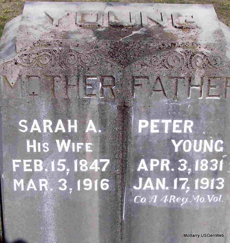 SSW: Sarah A. - Inscription: "Co A 4 Reg MO Vol" - Research Note: Civil War Veteran - Cassville Republican, Barry Co., MO, June 14, 1894 - Scott Reno has had Peter Young near Butterfield arrested for threatening or attempting to kill him with an axe. Mr. Young's hearing will come off Saturday. Prosecuting Attorney Beasley denies having entered to any law partnership with Scott. - Cassville Republican, January 23 1913 - W. R. Poplin of Butterfield was in Cassville, Monday. He reported the death of Peter Young, an aged citizen living northwest of Butterfield, Friday evening. His death was due to old age and paralysis. Mr. Young had lived in that vicinity for a number of years and leaves a wife and three children to mourn his death. Interment of his body was made at the Mt. Pleasant Cemetery, Sunday afternoon. - John Weaver of Butterfield, MO was the informant on the death certificate. Parents not named. | Death Certificate Online Newspapers Phyllis Long Photo Diana Cope |