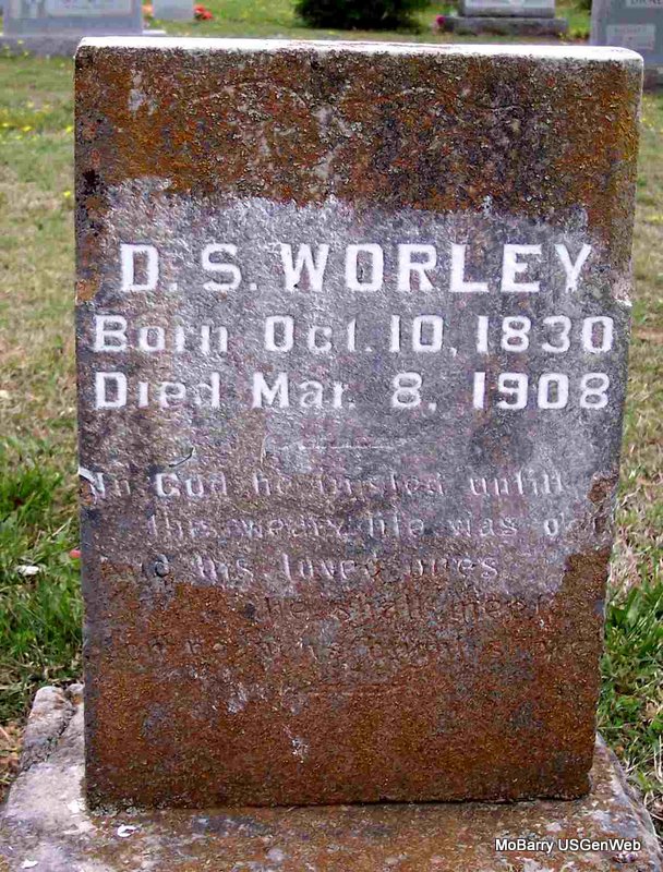 Research Note: Son of Malcom M. Worley and Sarah B. Noel. Dudley S. Worley married Polly Missouri Herron on June 20, 1852 in Taylor Co., KY. - Cassville Democrat, March 14, 1908 Shoal Creek News: Sunday night at about 8 o'clock, the death angel visited the home of Mrs. Edwards, and beckoned her father Mr. Worley, and his spirit took its heavenward flight, where there will be no more sorrow nor trouble. He had lived to be an old and faithful father. | Online Obit Census Phyllis Long Photo Diana Cope |