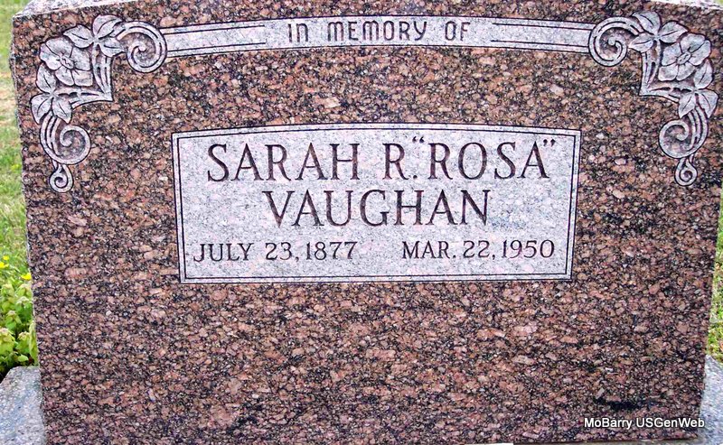 Research Note: Rosa was the wife of Francis Marion Vaughan and daughter of John Abner Witt and Canzada (Carver) (Messer) Witt. Francis Vaughan of Purdy, MO was the informant on the death certificate. Francis M. Vaughan, age 21, married Sarah R. Witt, age 20, on Aug. 11, 1898 in Barry Co., MO. - June 26, 1909, Saturday, Cassville Democrat - Mrs. John Witt who is at her daughter's Mrs. Vaughan, 3 miles out on the Springfield road, and is afflicted with dropsy, was much worse this week. | Family Records Janice Vaughan Death Certificate MO Marriage Records Online Newspapers Phyllis Long FGS Gerald H. Haddock Photo Diana Cope |