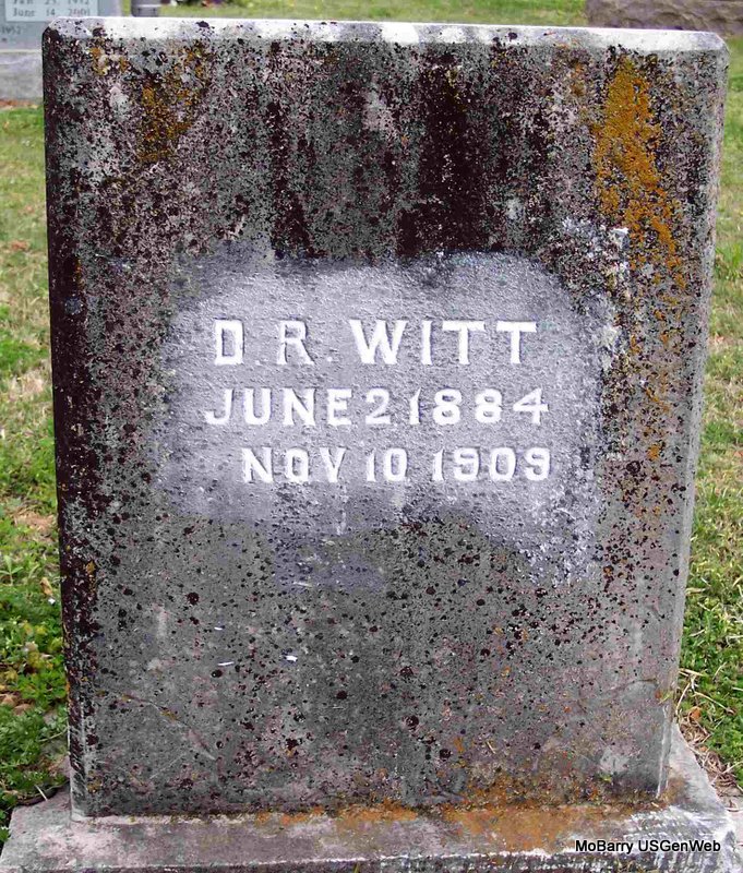Research Note: November 13, 1909, Cassville Democrat, Barry Co., MO - Dennis Witt died at Joplin Wednesday of pneumonia, and was buried Friday at Mt. Pleasant Cemetery, west of Butterfield. He left a wife to mourn his death. He was a son of Mr. and Mrs. John Witt and was raised north of this city. He was a splendid young man and had many friends here who will regret to learn of his death. - He was the son of John Abner Witt and Canzada Carver. They died in Afton, OK. His wife was Effie Mae Clark. She died in 1950 in San Francisco CA under the surname Witt. | Online Newspapers Census Phyllis Long Photo Diana Cope |