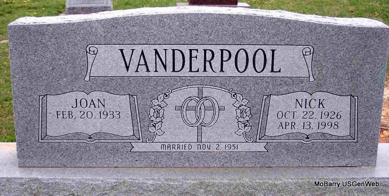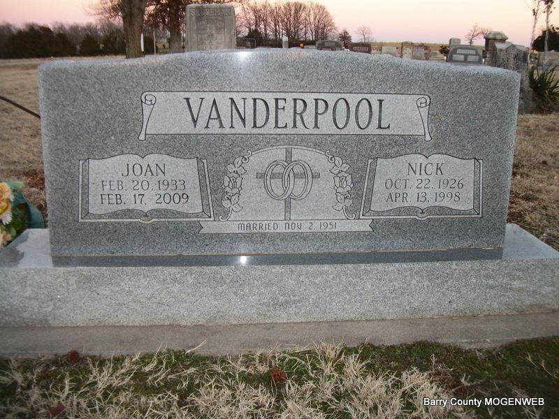| VANDERPOOL, Nick Joe | Oct. 22, 1926 | Apr. 13, 1998 | SSW: Joan - Inscription: "Married Nov. 2, 1951" - Research Note: He was the son of Joe L. Vanderpool and Zella Looney. They are both buried at Washburn Prairie Cemetery. 1930 Census gives the family in Washburn, Barry Co., MO. - Another Photo | Census Phyllis Long Photos Diana Cope |