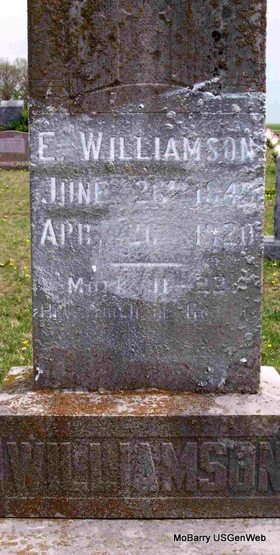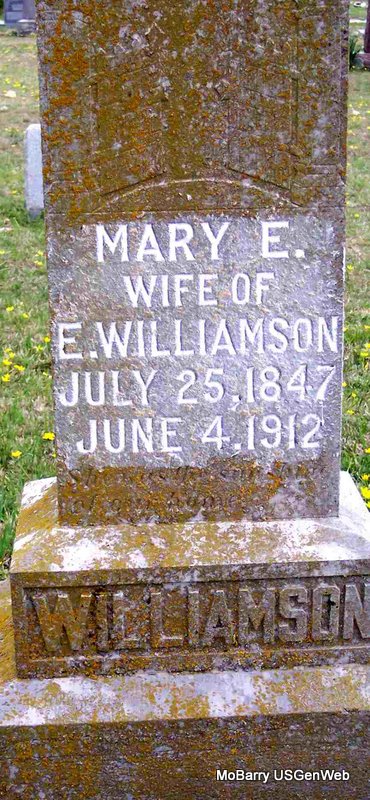 Inscription: "Wife of E." - Research Note: She was married and the daughter of McLain D. Davis and Berthena Brite both born in Tazewell Co., IL. Eleazer Williamson, her husband, of Purdy, MO was the informant. - Cassville Republican, June 13, 1912 - Gone Home: Mary E. Williamson died at her home northeast of Butterfield, Tuesday evening, age 64 years, 10 months, and 9 days. She leaves a bereaved husband, and three sons, a host of grandchildren and other relatives and friends to mourn their loss. She bore her suffering with great patience and was ready to go. May the sorrowing ones strive to meet her over on the other bright shore. The funeral services were conducted by her pastor, Rev. Chappell at her home. Her remains were laid to rest in the New Church cemetery. | Death Certificate Online Obit Phyllis Long Photo Diana Cope |