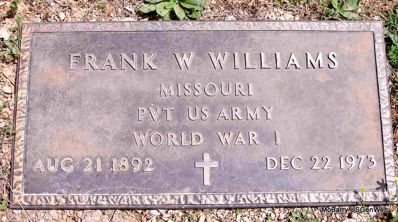 | WILLIAMS, Frank W. | Aug. 21, 1892 | Dec. 22, 1973 | Inscription: "MISSOURI PVT US ARMY WORLD WAR I" - Research Note: He was the son of William and Lula (Barnes) Williams. Still single in the 1940 census, living with his mother and sister. | Census Phyllis Long Photo Diana Cope |