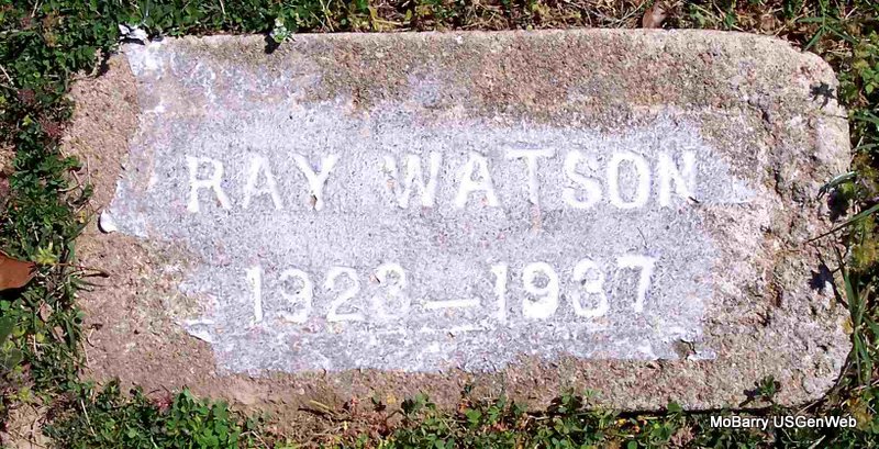 Research Note: He was the son of Tom Watson born Jefferson Co., Alabama and Verder Moore born Denton Co. TX. He was struck by a truck walking on Hwy. 37. - Cassville Republican, Dec. 2, 1937 - RAYMOND WATSON, about fourteen years old, of Butterfield, was struck by a truck on Highway 37 near the Butterfield grade school building, about dark Tuesday evening, and died a few minutes later while he was being brought to the Barry County Hospital here. The truck, a Farmers Exchange truck at Exeter, was driven by Ot Sapp who has worked for years for the Exchange at Exeter. Sapp had been to Springfield on business for the Exchange and was returning home. Some school children were on the highway near the Butterfield school buildings. Another motor vehicle was approaching and Sapp says in watching the other vehicle he did not see the boy who with other children seemed to have been playing along the Highway. County Coroner Floyd C. Callaway of Monett was notified of the accident and after investigating decided that the facts were so clear an inquest was unnecessary. George Ray, who lives near where the accident occurred, stated Wednesday while in Cassville that it was an unavoidable accident on the part of Mr. Sapp. Raymond is a son of Tom Watson. The family had formerly lived about Butterfield, and had later moved away. Raymond had been back for two weeks and was attending the Butterfield school. He is survived by his parents, four brothers and three sisters. | Death Certificate Online Obit Phyllis Long Photo Diana Cope |