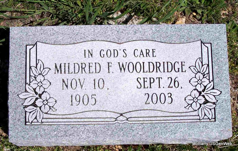 | WOOLDRIDGE, Mildred Fay | Nov. 10, 1905 | Sept. 26, 2003 Lawrence Co., MO |
