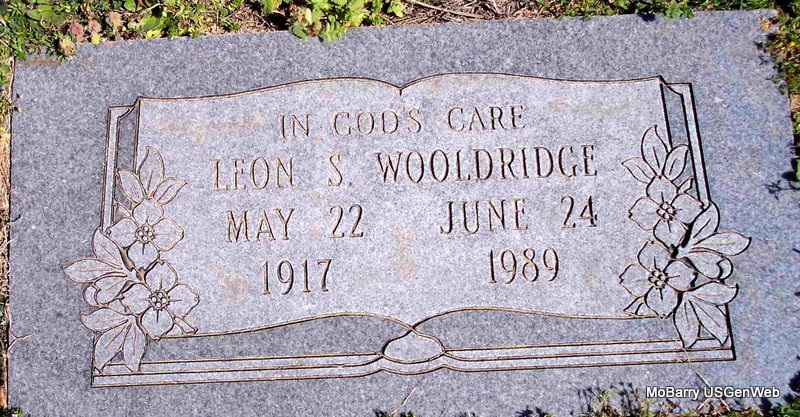 Inscription: "In God's Care" - Research Note: SSDI gives his last residence as Cassville Barry Co. MO. SSN issued in OK. He was the son of Adrian Martin Wooldridge and Margaret Ann Sampler. His wife was Mildred Fay. | Census Phyllis Long Photo Diana Cope |