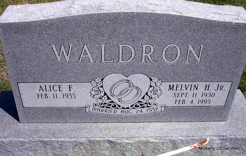 SSW: Melvin, Jr. - Inscription: "Married Aug. 24, 1957" - Research Note: She was the daughter of Neria and Maye Bell (Beaver) Pruitt. She grew up and received her education in Cassville graduating with the Class of 1953. On August 24, 1957, in San Antonio, Texas, she was united in marriage to Melvin H. Waldron, Jr., who was stationed in San Antonio with the United States Air Force. Throughout his twenty years of service, they lived in many states until they settled in Spring Hill, Florida in 1968, upon retirement. After her husband's illness, Alice and Melvin returned to Wheaton and the Cassville area. During her lifetime, Alice was employed in various food service establishments, with her last employment being with Wheaton Public Schools. She was preceded in death by her parents, her husband, Melvin, a brother, Gene Pruitt and a nephew, Steve Abram. - Another Photo | Fohn Funeral Home Phyllis Long Photos Diana Cope |