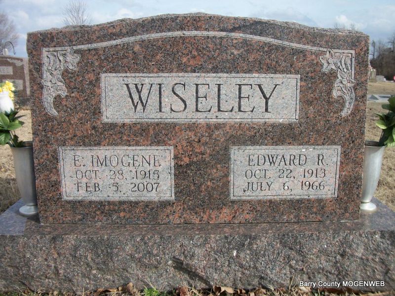 SSW: E. Imogene - Research Note: Imogene's obit reads that he died in 1956, the stone has the date of 1966. Death certificate has 1966. - He was the son of Claude Wiseley and Eulah Effie Ghan. Imogene was the informant. He was a switch engineer for the Frisco RR and suffered a heart attack while working at 10th and Pennsylvania Ave. in Joplin, Jasper Co., MO. - 1930 Census, Wheaton, Barry Co., MO - Edward is living with his grandparents, James and Margaret Wiseley. - Another Photo | Census Death Certificate Phyllis Long Photos Diana Cope |