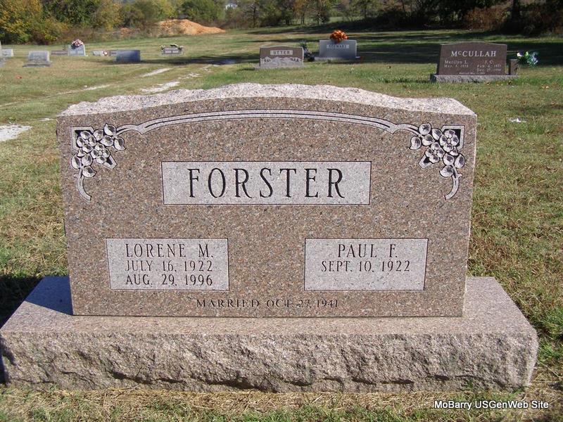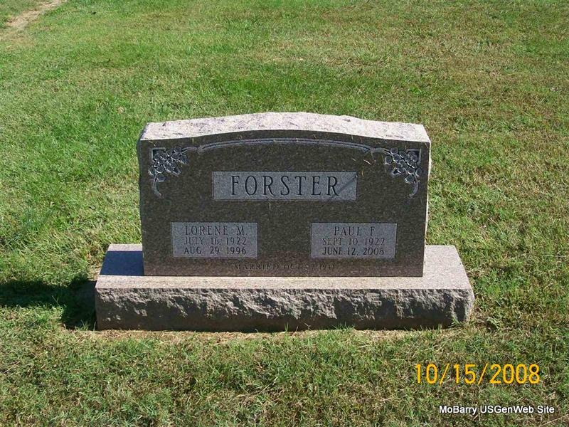 | FORSTER, Paul F. | Sept. 10, 1922 | June 12, 2008 | SSW: Lorene M. - Inscription: "Married Aug. 27, 1941" - Research Note: SSDI gives his last residence as Fulton, Callaway Co., MO. SSN issued in KS. - Another Photo | SSDI Phyllis Long Photo Ralph and Betty Lamberson Photo Jay Trace |