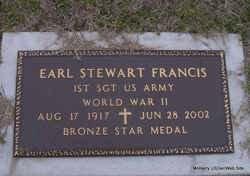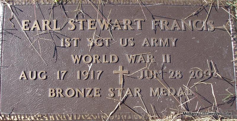 Inscription: "1st Sgt. US Army World War II Bronze Star Medal" - Research Note: Son of Maynard Finis Francis and Nannie Lee Stewart. His wife was Melba Evans. - Another Stone - Francis Headstone - Another Photo - Another Stone - Another Photo | Father's Obit Wife's Obit Census Phyllis Long Photo Jay Trace Photo Ralph and Betty Lamberson |
