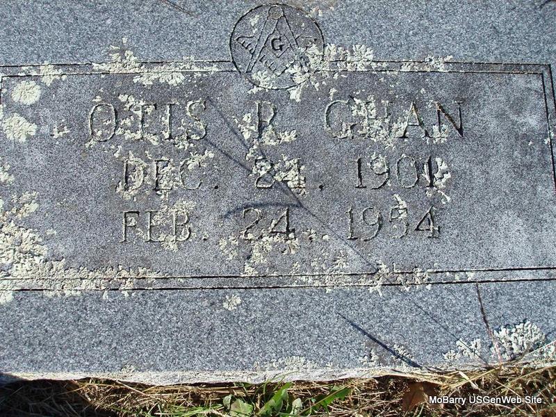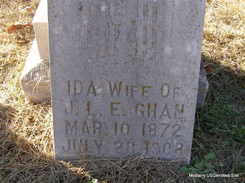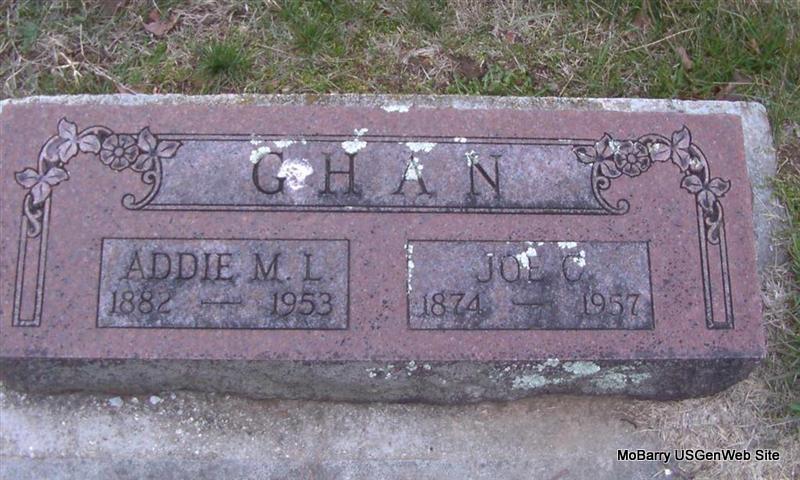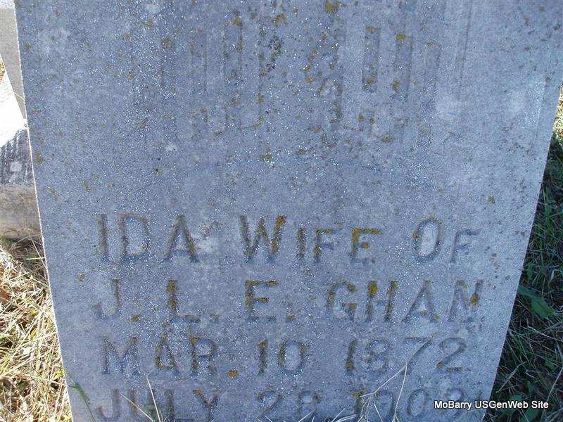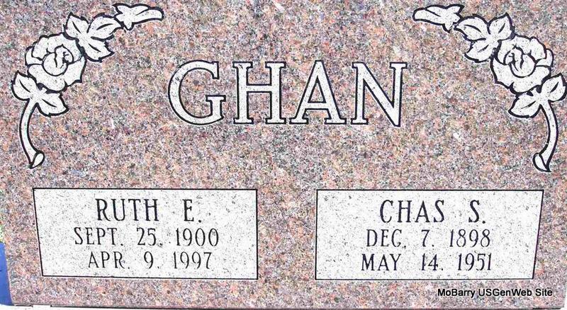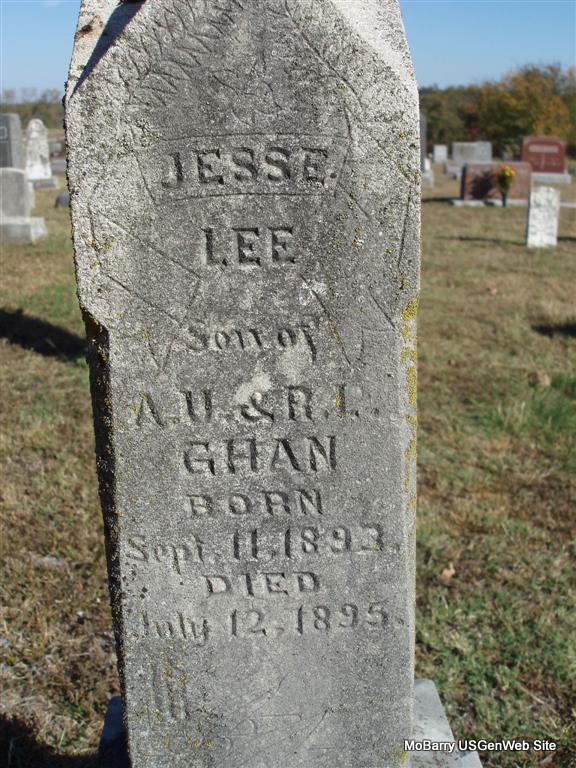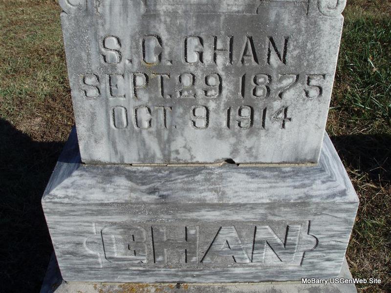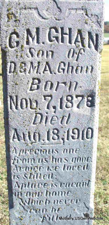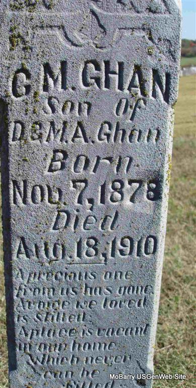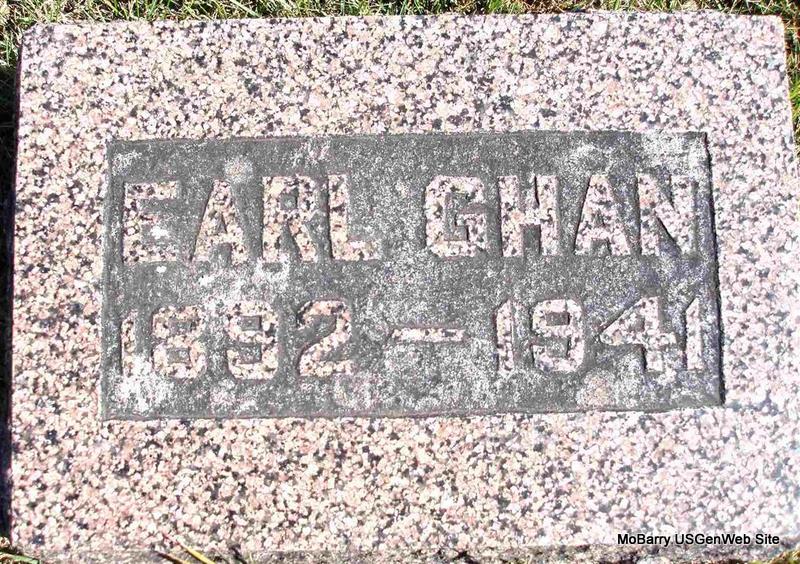| GHAN, Shelly C. | Sept. 29, 1875 | Oct. 9, 1914 | Research Note: Son of Daniel Ghan and Mary Ann Norvell. Shelly C. Ghan, age 24, married Florence Frazier, age 22, on June 3, 1900 in Newton Co., MO. - Cassville Republican, Barry Co., MO, Thursday, June 14, 1900 - Licensed to Wed: Shelby Ghan and Florence Frazier, Grangeville. | Census MO Marriage Records Online Newspapers Phyllis Long Headstone Mary Homesley Photo Jay Trace Photo Ralph and Betty Lamberson |