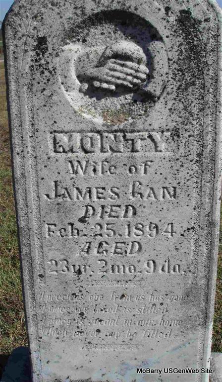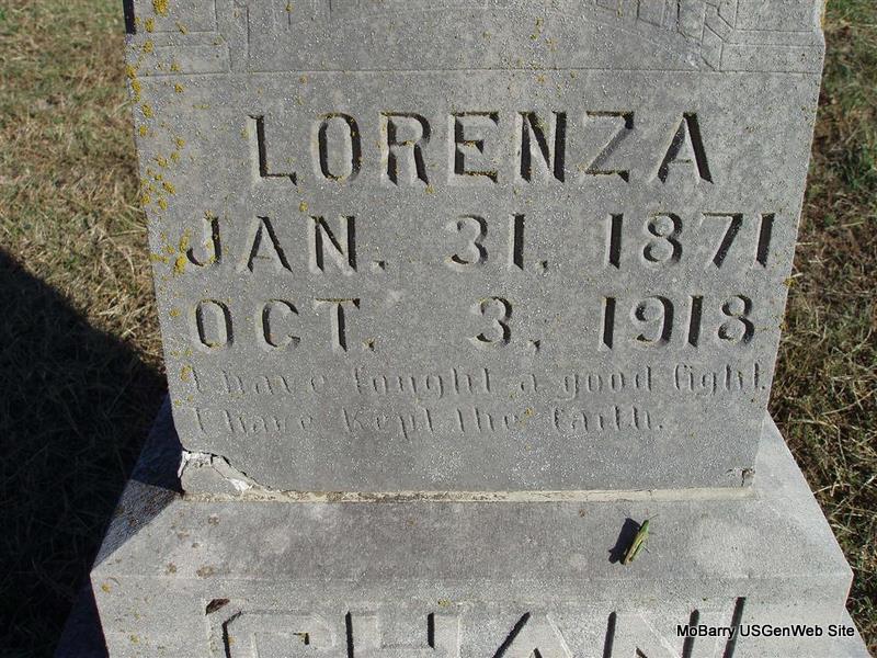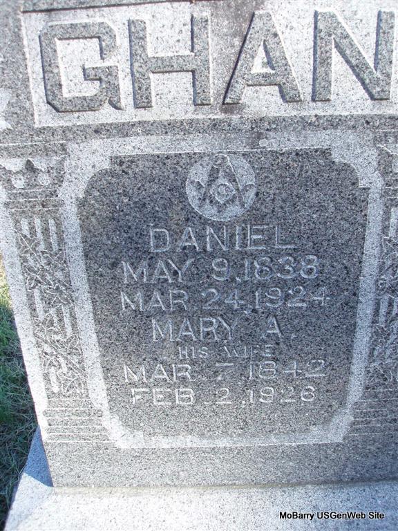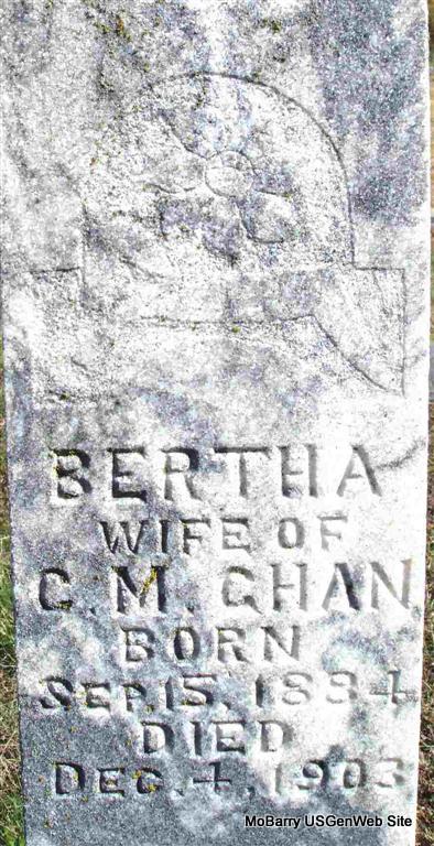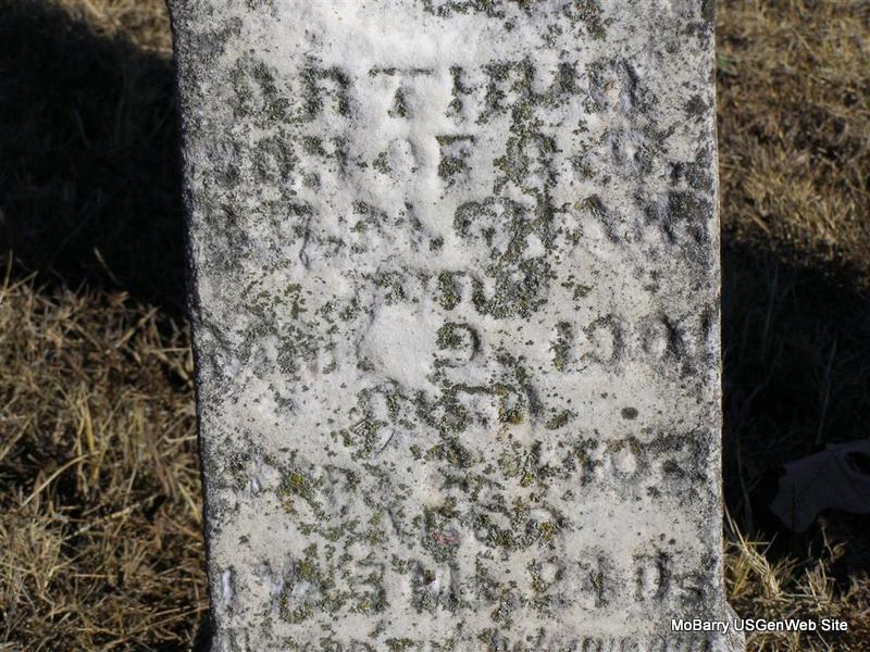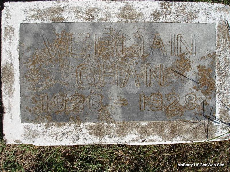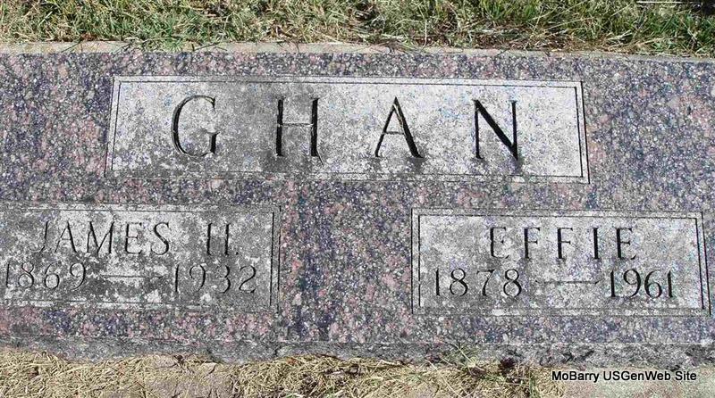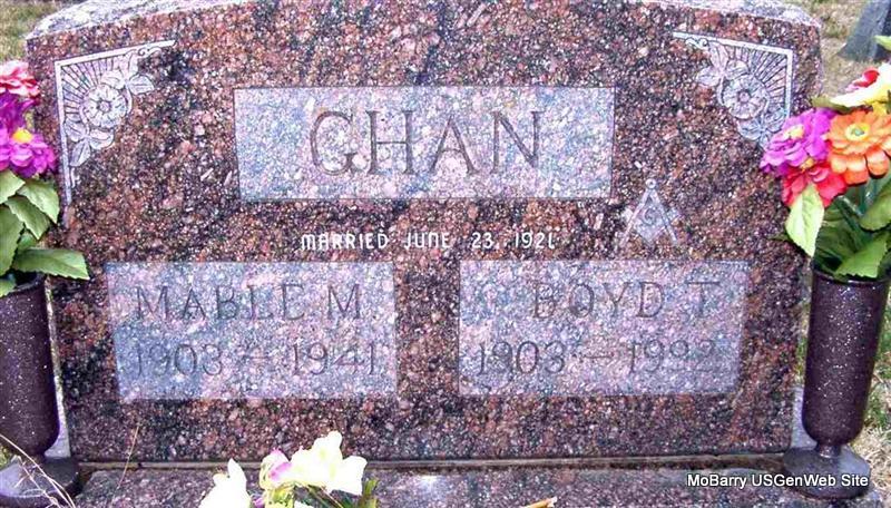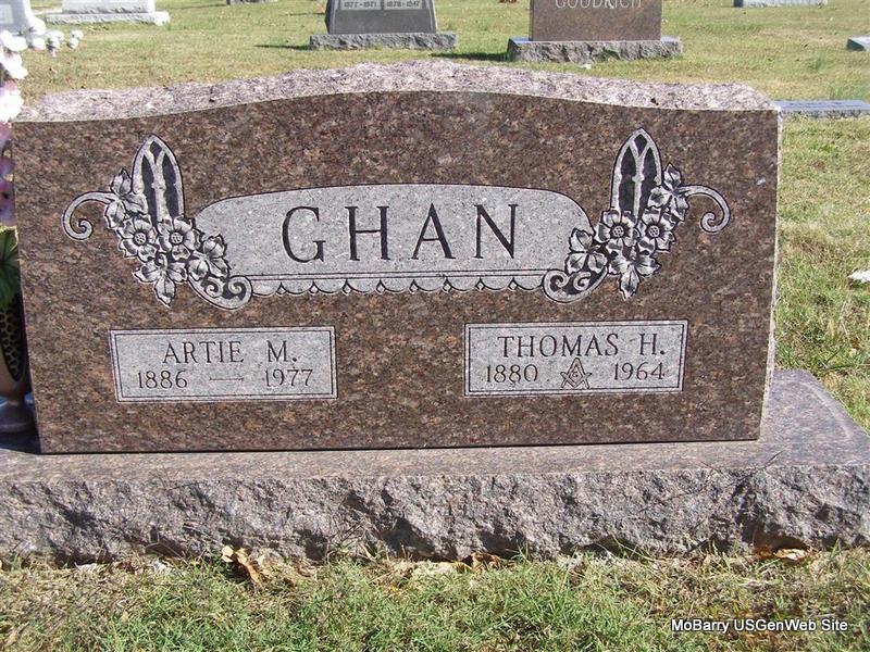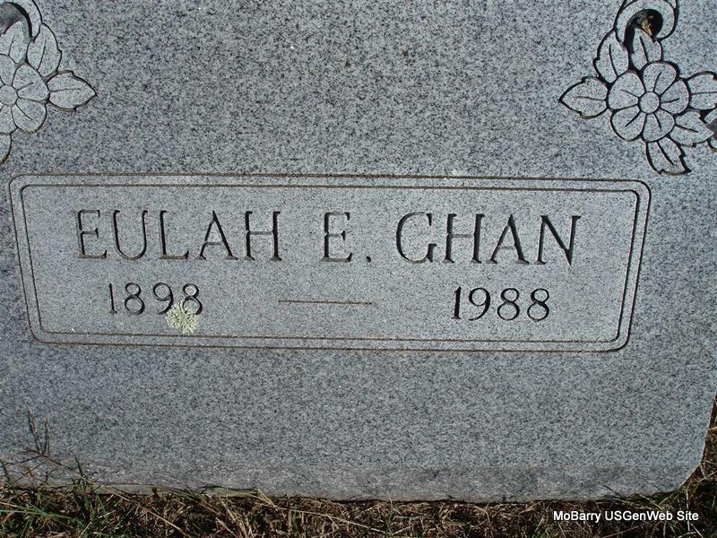 | GHAN, Shelly C. | Sept. 29, 1875 | Oct. 9, 1914 | Research Note: Son of Daniel Ghan and Mary Ann Norvell. Shelly C. Ghan, age 24, married Florence Frazier, age 22, on June 3, 1900 in Newton Co., MO. - Cassville Republican, Barry Co., MO, Thursday, June 14, 1900 - Licensed to Wed: Shelby Ghan and Florence Frazier, Grangeville. | Census MO Marriage Records Online Newspapers Phyllis Long Headstone Mary Homesley Photo Jay Trace Photo Ralph and Betty Lamberson |