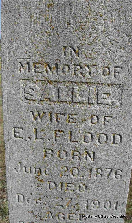 | FLOOD, Sarah "Sallie" (SALLEE) | June 20, 1876 | Dec. 27, 1901 | Inscription: "Wife of E. L. Flood" - Research Note: Sallie Sallee married Edward L. Flood on Jan. 15, 1898 in Barry Co., MO. | Census Phyllis Long Photo Ralph and Betty Lamberson |