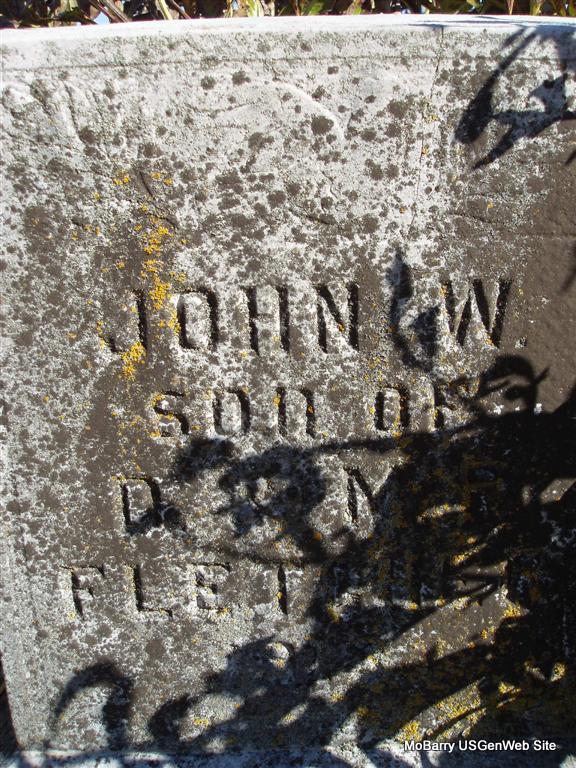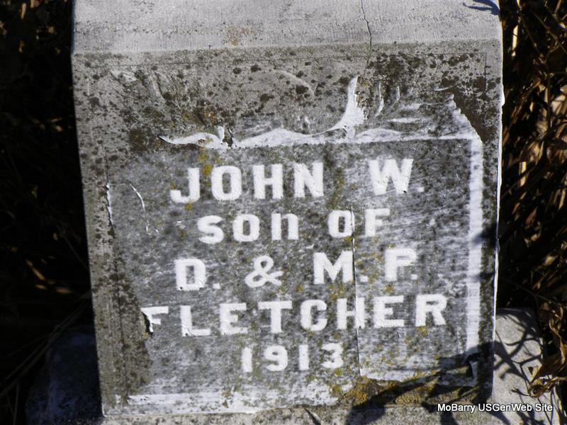Inscription: "Son of D. and M. P." - Research Note: Son of Daniel Fletcher born OH and mother's maiden name was Wimer? born IN. Daniel Fletcher of Fairview, MO was the informant on the death certificate. - Another Photo | Death Certificate Phyllis Long Photo Ralph and Betty Lamberson |