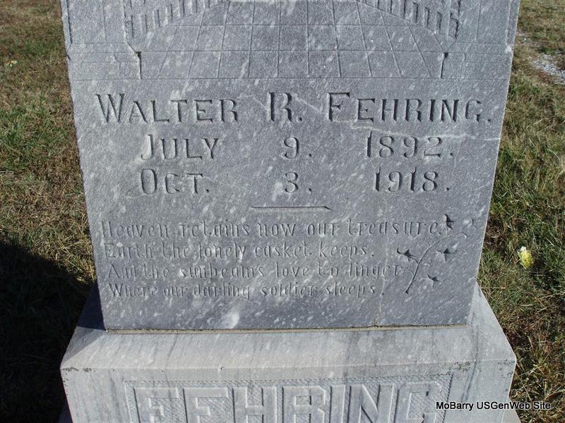Research Note: Son of Herman Fehring and Anna Rauch. Walter was one of many WWI soldiers who died from the influenza epidemic of 1918. Walter also had a brother, Henry Fehring, who served in WWI. Never married. - Cassville Republican, Thursday, Oct. 10, 1918 - Carl (should be Walter) Fehring who was in the training camp was brought to Wheaton Monday having died with the influenza. - Photo of Walter | Online Newspapers Phyllis Long Note Photo Ralph and Betty Lamberson |