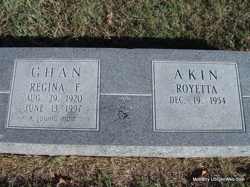 | GHAN, Regina Frances (BORUSHESKI) (AKIN) | Aug. 29, 1920 | June 13, 1997 | SSW: Royetta Akin - Inscription: "A Loving Mom" - Research Note: Roy Akin, age 30, married Regina Borusheski, age 28, on July 28, 1948 in Monett, Barry Co., MO. Roy is buried at Highland Park Cemetery, Kansas City, KS. He died in 1954. She second married John Loyd Ghan. Daughter of John Borusheski and Rosie Stipp. Royetta was her daughter. | SS Claims Index MO Marriage Records Phyllis Long Photo Ralph and Betty Lamberson |