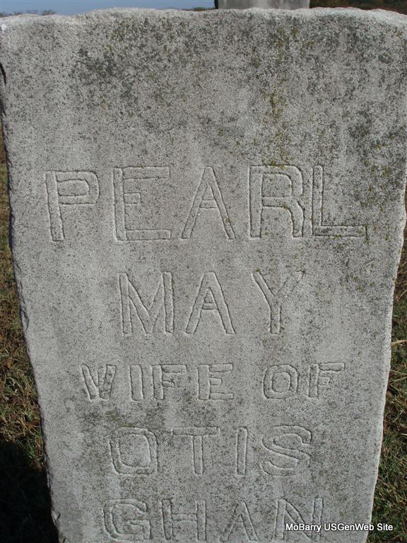 Inscription: "Wife of Otis Ghan" - Research Note: Wife of Otis R. Ghan - daughter of Dan and Laura (Robison) May. Otis Ghan of Wheaton, MO was the informant on the death certificate. - Wheaton Journal, August 9, 1928 - Mrs. Pearl Ghan, wife of Otis Ghan, died at her home in Wheaton, August 4th after an illness of several months. Her death was caused by a complication of diseases. She was a daughter of Mr. and Mrs. Dan May of Exeter. She was born October 18, 1903. Age 25 years, 10 months and 9 days. She was married to Otis Ghan December 24, 1925. To this union two children were born, one having preceding her in death. She was converted in 1923 and united with the Antioch Baptist Church. She is survived by her husband, Otis Ghan, one son, Verdain, her father and mother, six brothers and three sisters, two brothers and sisters in laws. Also a number of other relatives and a host of friends to mourn her death. Through all her sickness she was very patient. She was a kind and loving wife and mother, and will be sadly missed by all who knew her. Funeral services were conducted at the Muncey Chapel, north of Wheaton on Sunday afternoon, August 5th by Rev. Chas. Vanzandt. Burial in the Muncey Cemetery, under the direction of the Pogue Undertaking Service. A very large assembly of neighbors and friends gathered to pay a tribute of respect to her memory. - Photo of Pearl | Headstone Mary Homesley Death Certificate Donna Cooper Family Mike and Joy Online Obit Phyllis Long Photo Ralph and Betty Lamberson |