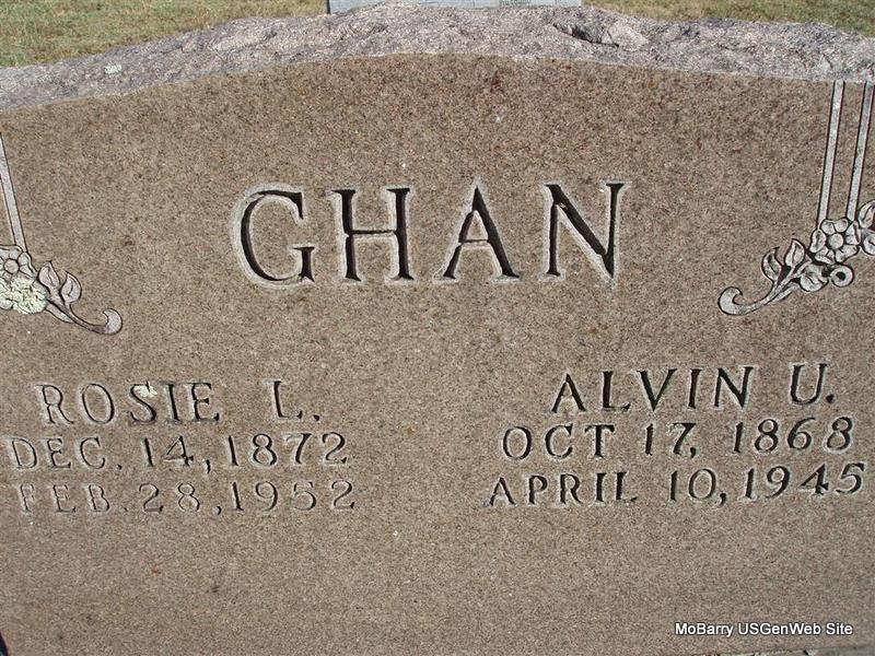 SSW: Alvin V. - Research Note: According to her death certificate, she was widowed, her mother's name was Ellen Hefley and Alvin U. Ghan was her husband's name. Mrs. Lula Davis gave the information. According to census, she might be the daughter of John M. Pearson and Clarissa Sarah Herriman. Rosa Pierson, age 19, married Alvin U. Ghan, age 23, on June 14, 1891 in Barry Co., MO. | Census MO Marriage Records Phyllis Long Headstone Mary Homesley Death Certificate Donna Cooper Photo Ralph and Betty Lamberson |