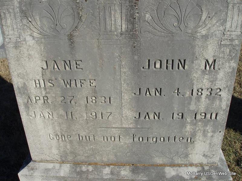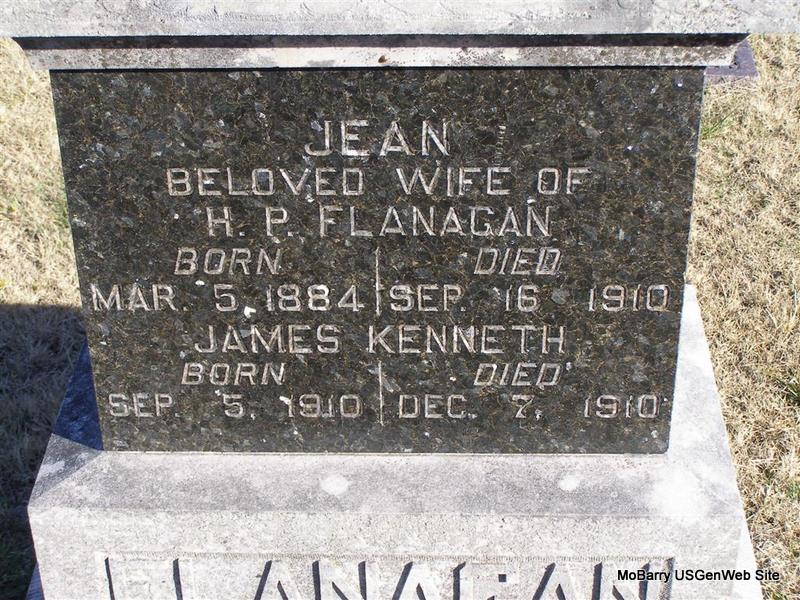 SSW: James Kenneth - Inscription: "Beloved wife of H. P. Flanagan" - Research Note: She is listed as Rebecca Jane Flanagan in death certificates and her stone reads Jean Flanagan. Died of septicemia. Informant was R. B. Gladden of Purdy, MO. Jean McQueen married Hugh Patrick Flanagan on Aug. 13, 1908 in Barry Co. MO. Daughter of James Elbert McQueen and Mary E. Gilbert, both buried at Muncie Chapel Cemetery. | Death Certificate Jay Trace MO Marriage Records Census Phyllis Long Photo Ralph and Betty Lamberson |