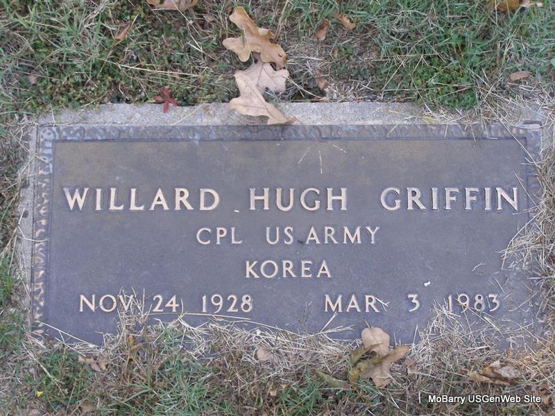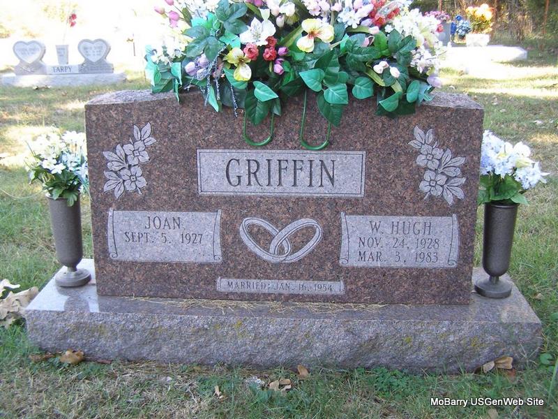 SSW: Joan - Inscription: "Married Jan. 16, 1954" - Research Note: Son of William A. Griffin and Hazel M. Ridpath. - ROCKY COMFORT, MO - Services for Hugh Griffin, 54, route 1, Rocky Comfort, who died at 11:35 a.m. Thursday at the Veteran's Administration Hospital, Little Rock, Ark., after an extended illness, will be 2 p.m. Sunday at Williamson Chapel in Cassville. The Rev. Richard Buck will officiate. Burial will be in the Muncie Chapel Cemetery north of Wheaton. Masonic services will be conducted at the chapel. The casket will be closed at all times. Born Nov. 24, 1928, in Pierce City, Mr. Griffin was a long-time resident of the Wheaton and Rocky Comfort communities. He was a farmer. He was a member of the First Baptist Church, Wheaton, Comfort Lodge No. 533, A F and AM Wheaton, Wheaton Veterans of Foreign Wars and a director of the Wheaton Saddle Club. He was a U.S. Army veteran of the Korean conflict. He married Joan Kerley Jan. 16, 1954. - Military Stone - Inscription: "CPL US ARMY KOREA" | Obit SS Claims Index Phyllis Long Photo Ralph and Betty Lamberson |