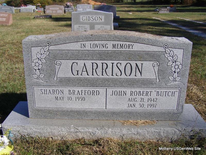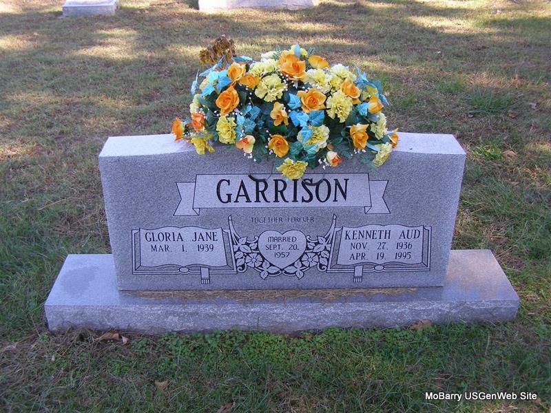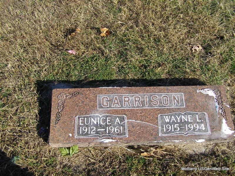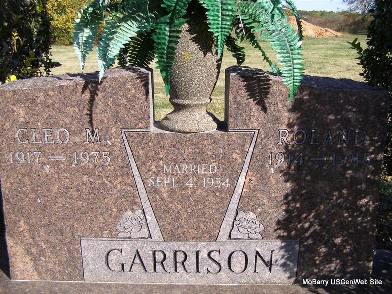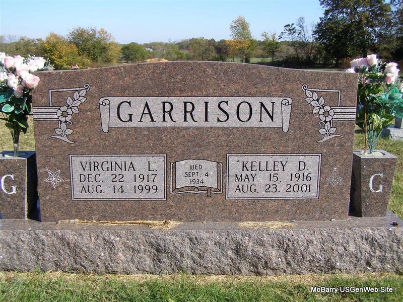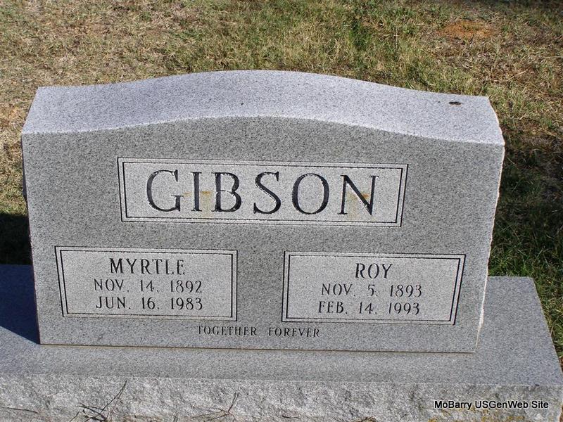 | GIBSON, Myrtle Ava (KELLY) | Nov. 14, 1892 | June 16, 1983 | SSW: Roy - Inscription: "Together Forever" - Research Note: Daughter of George Riley Kelly and Cynthia Theo Kimbrough. - May 12, 1917, Saturday, Cassville Democrat - A quiet little wedding was consummated and two excellent young people were started out in life together when M. R. (Roy) Gibson and Miss Myrtle Kelly of Wheaton, motored to Cassville, Sunday morning, May 6, 1917, and Rev. J. S. McQueen spoke the words which made them one. They were accompanied by Miss Monica Kelley and Bert Potts. The bride is a daughter of G. R. Kelly of Wheaton, and possesses all the qualifications that will make a happy home. The groom is a son of Mr. and Mrs. B. F. Gibson and is a bright, capable young man. He has for several months past been in the employ of the First National Bank at Monett, but has accepted a position with the Bank of Wheaton. Their prospects for future happiness are indeed very bright and we bespeak for them a life of happiness and usefulness. | Online Newspapers Census Phyllis Long Photo Ralph and Betty Lamberson |
