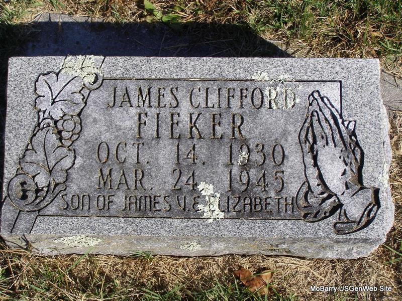 Inscription: "Son of James V. and Elizabeth" - Research Note: Son of James Vernon and Tishie (Lemon) Fiecker. - Cassville Republican, March 29, 1945 - BOY KILLED IN SATURDAY STORM - Barn Is Destroyed But Livestock Is Not Hurt - Fourteen year old James C. Fieker, son of Mr. and Mrs. James Fieker, Sr., of the Shoal Creek community east of Wheaton, was killed late Saturday afternoon by a severe wind storm which stuck and destroyed the barn at the Fieker place. Mr. and Mrs. Fieker and their son were at the barn when the storm came up Saturday afternoon late and seeing the bad looking cloud started from the barn to the house. The son turned back, however, into the barn and was killed. There are reported to have been 18 head of cows and 7 head of horses in the barn but none of them were killed. The wind with the force of a tornado laid the walls of the barn flat, and one of the walls as it fell stuck James. All of the buildings on the farm were destroyed except the dwelling house. Funeral services, under the direction of the Pogue Funeral Home of Wheaton were held Tuesday afternoon, March 27, at the Muncie Chapel, and burial made there. He is survived by his parents, two brothers, Charles and Robert; two sisters, Betty and Adeline. The farm on which the Fieker family live is owned by W. C. Chenoweth of Wheaton. | Death Certificate Online Obits Phyllis Long Photo Ralph and Betty Lamberson |
