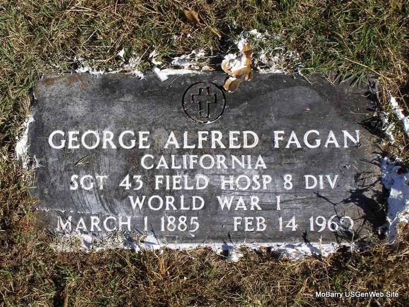Inscription: "CALIFORNIA SGT 43 FIELD HOSP 8 DIV WORLD WAR I" - Research Note: He was a realtor. Son of George W. Fagan and Elizabeth Slimp. Mrs. Fred Bowles of Southwest City, MO was the informant on the death certificate. Listed as single in the 1940 census. | Death Certificate Census Phyllis Long Photo Ralph and Betty Lamberson |