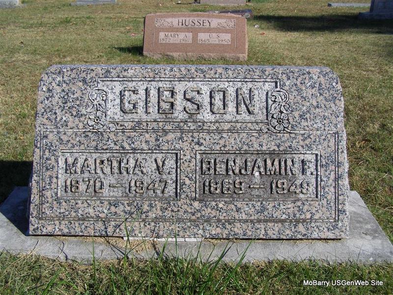 SSW: Martha V. - Research Note: Hospital records were the informant and very little info on the death certificate. - Joplin Globe, Mar. 3 1949 - Neosho, Mo., March 2 - Ben F. Gibson, 79 years old, first mayor of Wheaton, died at 10:45 o'clock this morning in Neosho. Son of Archibald and Harriet E. (Misenheimer) Gibson. Born in Barry County, Mr. Gibson established the town of Wheaton and was the town's first mayor and for many years operated a retail store there. He later moved to Newton County and two years preceding his death resided in Kansas City. He had been in failing health eight years. Surviving are a son, M. R. Gibson, city clerk of Neosho; a daughter, Mrs. Edna McGlothlin of Liberty; three grandsons, Harold Gibson of Neosho, Harry Gibson of Iola, Kan., and R. E. McGlothlin of Phoenix, Ariz., and two great-grandchildren. Arrangements are in charge of the Clark-Bigham funeral home. | Death Certificate Clark Funeral Home Brother's Obit Phyllis Long Photo Ralph and Betty Lamberson |