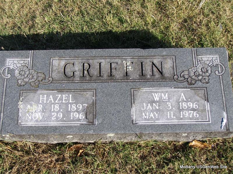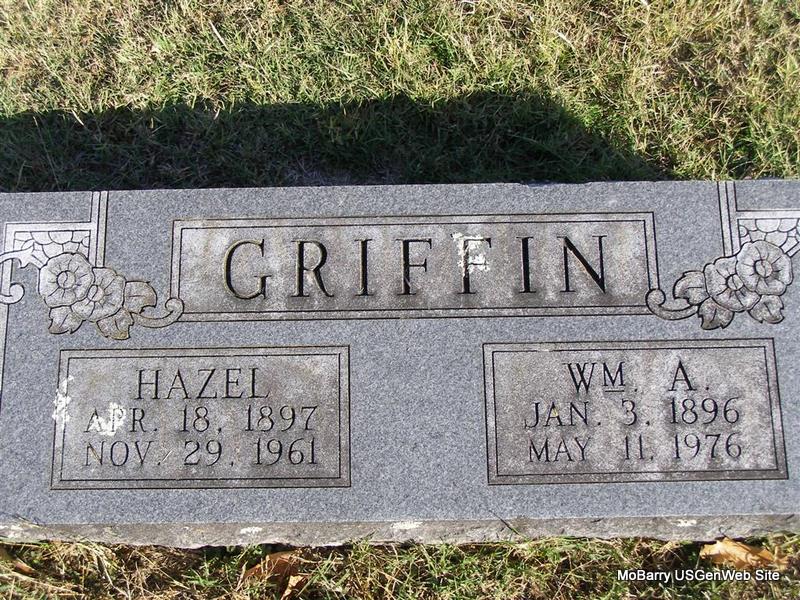 | GRIFFIN, William Asa | Jan. 3, 1896 | May 11, 1976 | SSW: Hazel - Research Note: Son of Joseph Griffin and Mary Ellen Wiley. William Asa Griffin, age 66, second married Mittie Ramsour, age 65, on Apr. 7, 1962 in Joplin, Jasper Co., MO. - Another Photo | MO Marriage Records Census Phyllis Long Photo Ralph and Betty Lamberson |