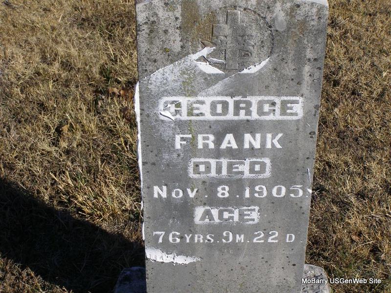Inscription: "76 Yrs 9 M 22 D" - Research Note: In 1870 George and Susan Frank were living in Shoal Creek Twp., of Barry County. They had listed Clayton, Edward E. and Jesse J. as children. Susan died in 1911 and is buried at Walnut Hill Cemetery in Kingman, KS. - Son of Matthew Frank and Barbara Loy. His personal estate was valued at $37. 75 and inventory was signed by Susan Frank, widow of George Frank. Edward E. Frank (son) was the administrator. | Census Jay Trace Newton Co. Probate Records Phyllis Long Photo Ralph and Betty Lamberson |