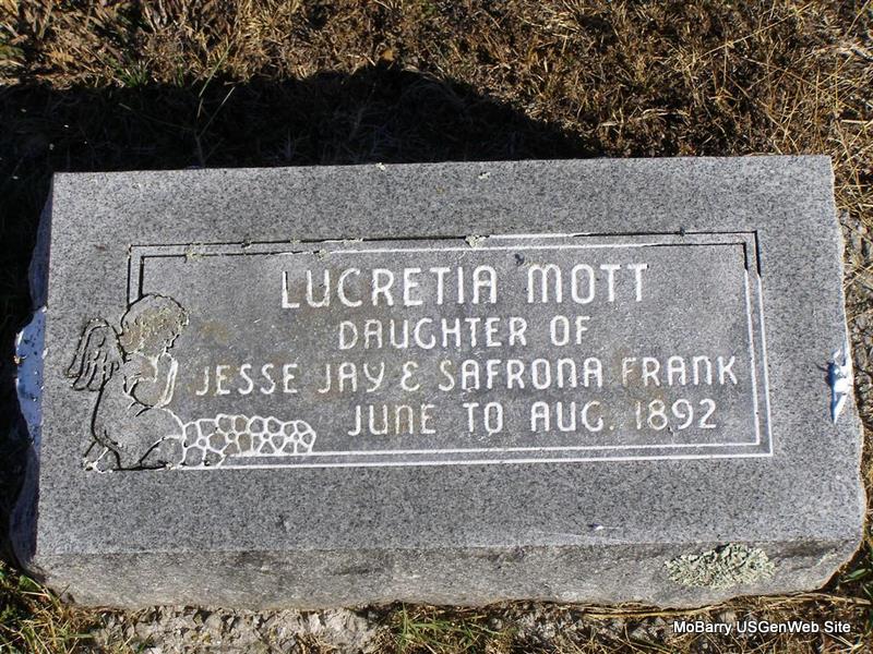 | FRANK, Lucretia Mott | June 1892 | Aug. 1892 | Inscription: "Dau. of Jesse J. and Safrona Frank" - Research Note: Granddaughter of George and Susan Frank. | Note Phyllis Long Photo Ralph and Betty Lamberson |