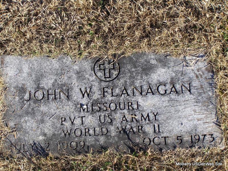 | FLANAGAN, John William | July 2, 1909 | Oct. 5, 1973 | Inscription: "MISSOURI PVT US ARMY WORLD WAR II" - Research Note: SSDI gives his last residence as Phoenix, Maricopa Co., AZ. Son of Hugh Patrick Flanagan and Rebecca Jean McQueen. | SSDI Census Phyllis Long Photo Ralph and Betty Lamberson |