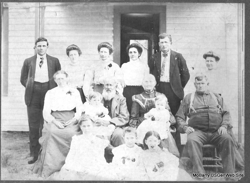 This Barry County, MO, photo was taken about 1904 -1905. It was taken at the farm of William "Billy" E. Poor and Cynthia (Gardner) Poor. Standing from left to right are: John Isaac Steele, Ada Poor Steele, Ellen Poor Johnston, Ida M. Gentry Poor, Will Poor, Nora Poor Harrison. Seated from left to right are: Sophronia Poor Frank, William E. Poor, Cynthia Gardner Poor, Milton D. Poor. The children on the laps of Billy and Cynthia Poor are probably Carl Poor (son of Will and Ida) and Burnela Steele (a son of Ada and John Steele). Burnela died in 1905 and was buried at Muncie Chapel Cemetery as are many other family members. The children seated in front are probably Ellen's two children and perhaps one of Sophronia's children? The family is unsure? Billy Poor and Cynthia were the parents of 11 or 12 children. Ada, my great grand mother, Ellen, Will, Sophronia, Nora, Milton were 6 of those children. Unfortunately, the photo was damaged some in a flood. Submitted in 2006 by Kande Charsha |