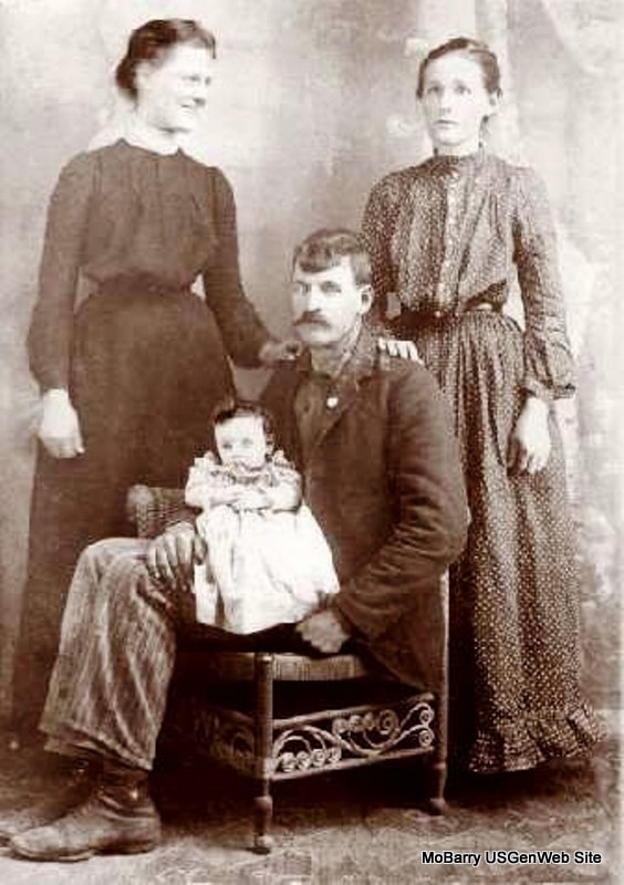 Left to Right: Back Row: Macy (Skelton) Porter & Dora (Hopkins) Ball (1/2 sisters) John Benjamin Ball holding Jennie Ball. (May have been named for the other 1/2 sister, Jennie (Skelton) Ball.) Submitted by Georgia Farwell |