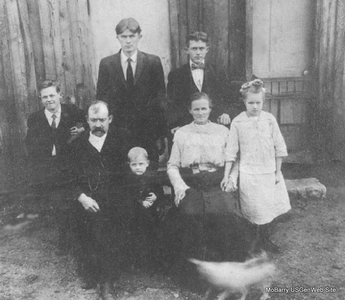 Back Row: Charley, Evert Front Row: Earl, Jonas Casper "Cap" - holding Oliver, Elizabeth (Parrish) & Jewell. Not present were Bessie and Gertrude. Gary Ball added in Feb. 2014, "Uncle Earl said the dog's name was Scotty." Submitted in 2007 by Gary Ball |
