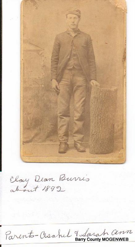 1 Clay Dean Burris b: Nov 06, 1871 in Hancock Co., IN d: Feb 04, 1929 in Eagle Rock, Barry Co., MO Burial: Munsey Cemetery, Roaring River Community, Barry Co., MO +Sarah Edith Leakey b: Aug 26, 1868 in Henry Co., IN m: Aug 09, 1895 in Barry Co., MO d: Sep 16, 1947 in Barry Co., MO Burial: King Cemetery, Seligman, Barry Co., MO 2 Loui Burris b: Nov 01, 1895 in Eagle Rock, Barry Co., MO d: Nov 14, 1975 in Barry Co., MO Burial: King's Cemetery, Seligman, Barry Co., MO +James Wesley Garrett b: Sep 1881 in Sweet Springs, Saline Co., MO d: Jun 10, 1956 in Barry Co., MO *2nd Husband of Loui Burris: +Wesley W. Shrum b: Dec 17, 1887 in Barry Co., MO m: Dec 1911 in Barry Co., MO d: Oct 22, 1949 in Barry Co., MO Burial: King's Cemetery, Seligman, Barry Co., MO 2 Anna Burris b: Apr 28, 1898 in Eagle Rock, Barry Co., MO d: Jul 31, 1965 in Barry Co., MO Burial: Munsey Cemetery, Barry Co., MO +Joseph Stringer b: Nov 02, 1888 in Eagle Rock, Barry Co., MO m: Jan 1915 in Barry Co., MO d: Aug 30, 1976 in Barry Co., MO Burial: Munsey Cemetery, Barry Co., MO 2 Maggie May Burris b: Mar 22, 1900 in Eagle Rock, Barry Co., MO d: May 09, 1939 in Eagle Rock, lBarry Co., MO Burial: Mano Cemetery, Barry Co., MO +Samuel Floyd Munday b: Nov 02, 1896 in Barry Co., MO m: Abt. 1921 in Barry Co., MO d: Nov 02, 1980 in Barry Co., MO Burial: Mano Cemetery, Barry Co., MO 2 Eula Pearl Burris b: 1908 in Eagle Rock, Barry Co., MO d: 1984 in California Burial: Washburn, Barry Co., MO +Warren Vosburgh b: 1905 d: 1987 Burial: Washburn, Barry Co., MO 2 Alva Wayne Burris b: Sep 28, 1911 in Eagle Rock, Barry Co., MO d: Sep 30, 1976 in Woodlake, Tulare, California +Faye Calista Fine b: May 28, 1909 in Barry Co., MO m: Abt. 1930 in Barry Co., MO d: Mar 19, 1991 in Woodlake, Tulare, California 1 Sarah Edith Leakey b: Aug 26, 1868 in Henry Co., IN d: Sep 16, 1947 in Barry Co., MO Burial: King Cemetery, Seligman, Barry Co., MO +William Bradford b: Abt. 1868 m: Abt. 1889 2 John Bradford b: Sep 1890 in Barry Co., MO 2 George Bradford b: Abt. 1893 in Barry Co., MO 2 Angie Bradford b: Bet. 1895 - 1905 in Barry Co., MO d: Bef. 1910 in Barry Co., MO *2nd Husband of Sarah Edith Leakey: +Clay Dean Burris b: Nov 06, 1871 in Hancock Co., IN m: Aug 09, 1895 in Barry Co., MO d: Feb 04, 1929 in Eagle Rock, Barry Co., MO Burial: Munsey Cemetery, Roaring River Community, Barry Co., MO 2 Loui Burris b: Nov 01, 1895 in Eagle Rock, Barry Co., MO d: Nov 14, 1975 in Barry Co., MO Burial: King's Cemetery, Seligman, Barry Co., MO +James Wesley Garrett b: Sep 1881 in Sweet Springs, Saline Co., MO d: Jun 10, 1956 in Barry Co., MO *2nd Husband of Loui Burris: +Wesley W. Shrum b: Dec 17, 1887 in Barry Co., MO m: Dec 1911 in Barry Co., MO d: Oct 22, 1949 in Barry Co., MO Burial: King's Cemetery, Seligman, Barry Co., MO 2 Anna Burris b: Apr 28, 1898 in Eagle Rock, Barry Co., MO d: Jul 31, 1965 in Barry Co., MO Burial: Munsey Cemetery, Barry Co., MO 2 Maggie May Burris b: Mar 22, 1900 in Eagle Rock, Barry Co., MO d: May 09, 1939 in Eagle Rock, lBarry Co., MO Burial: Mano Cemetery, Barry Co., MO +Samuel Floyd Munday b: Nov 02, 1896 in Barry Co., MO m: Abt. 1921 in Barry Co., MO d: Nov 02, 1980 in Barry Co., MO Burial: Mano Cemetery, Barry Co., MO 2 Eula Pearl Burris b: 1908 in Eagle Rock, Barry Co., MO d: 1984 in California Burial: Washburn, Barry Co., MO +Warren Vosburgh b: 1905 d: 1987 Burial: Washburn, Barry Co., MO 2 Alva Wayne Burris b: Sep 28, 1911 in Eagle Rock, Barry Co., MO d: Sep 30, 1976 in Woodlake, Tulare, California +Faye Calista Fine b: May 28, 1909 in Barry Co., MO m: Abt. 1930 in Barry Co., MO d: Mar 19, 1991 in Woodlake, Tulare, California *3rd Husband of Sarah Edith Leakey: +Ansel Dewane Polly b: Jan 30, 1859 in Massachusetts m: Bef. 1940 d: Dec 15, 1943 in Barry Co., MO Burial: King Cemetery, Barry Co., MO From Darla Ball Marbut- I enjoyed the photo of Clay Dean Burris. Just one correction ... daughter Louie first married Wesley W. Shrum and ..."Research Note: Wesley W. Shrum's death certificate - born Dec 17, 1888 at Eagle Rock, MO, died Oct 22, 1949. He was married to Louie Burris. He died Oct 22, 1949 and is buried in Kings Cemetery, Barry Co., Mo. His parents were William P. Shrum and his wife Mary Robbins." Then she married my Great Uncle James "Jim" Garrett in the 1950s. (Jim looked and acted like John Wayne. ha) Jim's first wife was Adaline "Aunt Addie" Maloney Garrett. She was my Grandfather Henry Maloney's sister. They had a large family. Chart and Data added by Donna Cooper Photo Submitted by Patricia Garrett |