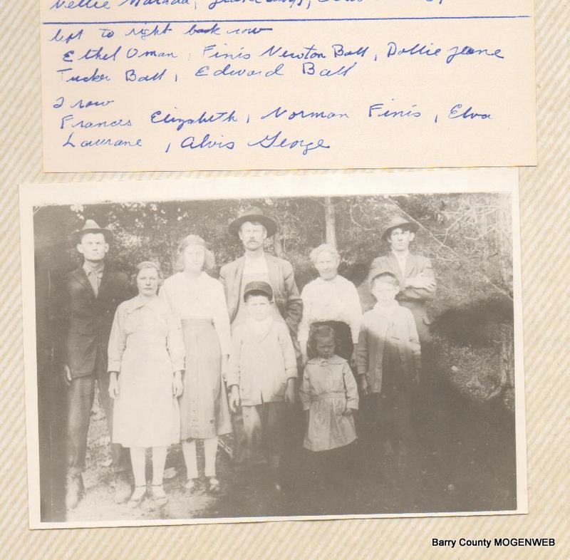 Descendants of Finas Newton Ball 1 Finas Newton Ball b: May 23, 1871 in Barry Co., MO d: Mar 30, 1956 in Barry Co., MO Burial: Munsey Cemetery, Barry Co., MO +Dollie Jane Tucker b: Jun 27, 1875 in Barry Co., MO m: Nov 09, 1892 in Barry Co., MO d: May 21, 1964 in Cassville, Barry Co., MO Burial: Munsey Cemetery, Barry Co., MO 2 Ball b: Abt. 1893 in Barry Co., MO 2 Truman Eldon Ball aka: Eldon b: Mar 17, 1895 in Eagle Rock, Barry Co., MO +Eva Jane Prier b: Abt. 1895 in Barry Co., MO m: Jan 14, 1917 in Eagle Rock, Barry Co., MO 2 Charles Elmon Ball b: May 26, 1896 in Eagle Rock, Barry Co., MO d: Jun 25, 1974 in Barry Co., MO +Ora Mae Prior b: Apr 04, 1896 in Butterfield, Barry Co., MO m: Jan 14, 1915 in Eagle Rock, Barry Co., MO d: Mar 28, 1993 in Barry Co., MO 2 Edward Ball b: Oct 31, 1897 in Barry Co., MO d: Aug 25, 1979 Burial: Corinth Cemetery, Washburn, Barry Co., MO +Dora Buchannan b: Abt. 1897 m: Oct 30, 1919 *2nd Wife of Edward Ball: +Lorena Margaret Carter b: Dec 17, 1913 in Barry Co., MO m: Oct 26, 1928 in Barry Co., MO 2 Ethel Oman Ball b: Apr 12, 1900 in Barry Co., MO +Edith Pansy Carter b: Abt. 1900 2 Edna Sara Ball b: Jun 04, 1901 in Barry Co., MO d: Apr 06, 1902 in Barry Co., MO 2 Maye Louisia Ball b: May 04, 1904 in Barry Co., MO d: Feb 01, 1921 in Barry Co., MO 2 Frances Elizabeth Ball b: Dec 31, 1905 in Barry Co., MO d: Dec 15, 1996 in Barry Co., MO Burial: Horner Cemetery, Barry Co., MO +William Elmer Cooper b: May 09, 1904 in Barry Co., MO m: Nov 08, 1924 in Barry Co., MO d: Nov 21, 1998 in Barry Co., MO Burial: Horner Cemetery, Barry Co., MO 2 Norman Finas Ball b: Jun 07, 1907 in Barry Co., MO +Maudie M. b: Abt. 1914 in Louisana m: Abt. 1930 in Barry Co., MO 2 Alvis George Ball b: Jan 10, 1909 in Barry Co., MO d: May 30, 1936 in Barry Co., MO +Bertie Clora Skelton b: Jun 14, 1911 in Barry Co., MO m: Jan 13, 1930 in Barry Co., MO d: Mar 28, 1990 in Barry Co., MO 2 Martha Rebecca Ball b: Jan 03, 1911 in Barry Co., MO d: Dec 29, 1915 in Barry Co., MO 2 Elva Lourane Ball b: Mar 19, 1913 in Barry Co., MO d: Oct 11, 1920 in Barry Co., MO Burial: Munsey Cemetery, Barry Co., MO Mary Dorthlan Earls Stringer on Facebook, Barry County Places and Things Remembered said, If this would be of interest to anyone, Alvis Ball died in Klamath Falls Oregon. He was buried close to Chiloquin, Oregon. Chart Submitted in 2011 by Donna Cooper Patricia Garrett's Family Photos Submitted by Patricia Garrett - Photo Restored by Gary Ball |