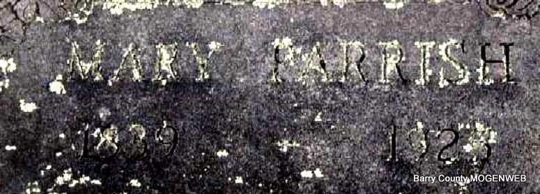 Research Note: Mary F. Yates married George Parrish. The family was in the1880 Roaring River Twp., Barry Co., MO, Census - George Par(r)ish 40 born in IN, Mary F. (Yates), 38 born in IL, Children all born in Kansas: Hester 15 (1865), Lotta 11 (1869), Cara 9 (1871), William 8 (1872), Lizza (Elizabeth b. Sep 29, 1873), Burton 3 (1877). | Photo Census Darla Ball Marbut |