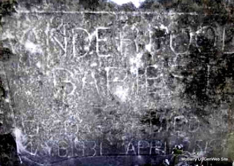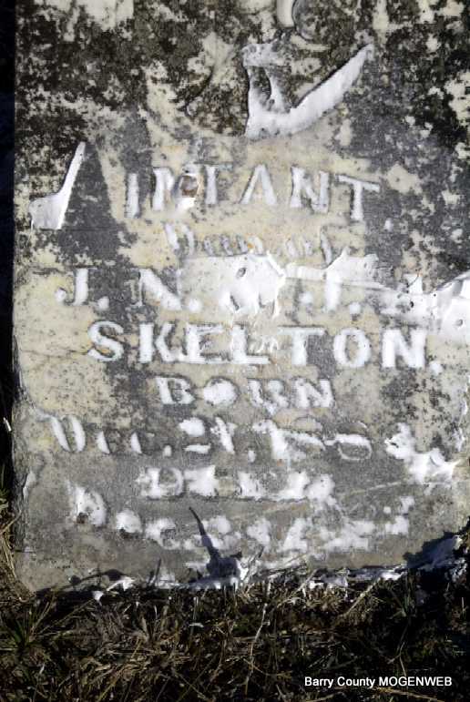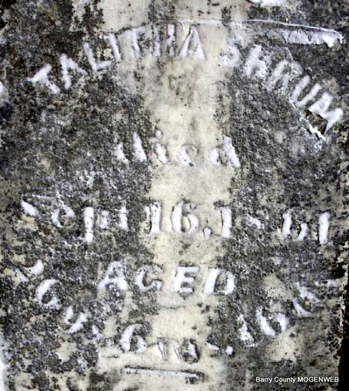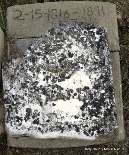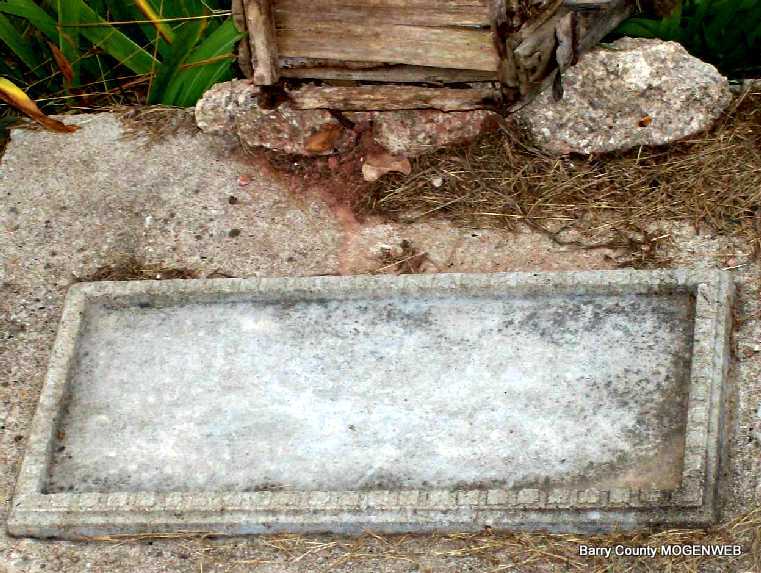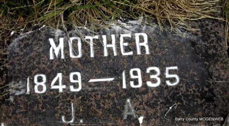 Inscription: "Age 33, Wife of L. B. Upton" - Research Note: According to the 1880 Roaring River Twp., Barry Co., MO census, Nancy A. was born in 1848 in TN and her husband was Louis B. Upton, born in KY. Their children were, Odeliea Upton (Daughter) born in TN 1871, Lewis Upton born in 1873 in MO, Joel Upton born in 1878 in MO., daughter, Rada born 1879 in MO. Lewis Upton was listed in the 1890 Flat Creek Twp., Barry Co., MO Census with a new wife, Platta M. born Jan. 1856, Benjamin Upton born Jan. 1885 and Etta A. Upton born Dec. 1888. -Cassville Republican, September 7,1893 - L. B. Upton has been down working the roads in these parts and I must say that he has put the roads in good fix. | Note Census Online Newspapers Photo Darla Ball Marbut |