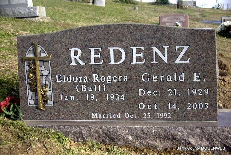SSW: Gerald E. Redenz - Inscription: "Married Oct. 25, 1992" - Research Note: Eldora Shirley Ball was the daughter of Ethel and Edith (Carter) Ball. She was a school teacher for many years. She first married Gene Rogers who died 1984. She married Gerald Redenz Oct. 25, 1992. - On November 25, 1957, she was united in marriage to Gene Byron Rogers, who preceded her in death in 1986. On October 25, 1991, in Eagle Rock, she married Gerald "Jerry" Redenz, who died October 14, 2003. Eldora grew up in Eagle Rock. She received her education at Munsey and Eagle Rock Elementary and graduated from Cassville High School. In 1953 she attended Southwest Baptist University at Bolivar, Missouri for one year. She then transferred to SMS (now MSU) for a year. In 1963 she received her Masters Degree from Northwest Missouri State University in Maryville, Missouri. Eldora began her teaching career in a one-room school house in Andrew County, Missouri. As the districts consolidated she remained in that area, retiring from the Savannah R-III School District after thirty-two years of teaching. For several years she was librarian for the Eagle Rock Community Center. | Fohn Funeral Home Phyllis Long Photo Census Tombstone Family Records Darla Ball Marbut |
