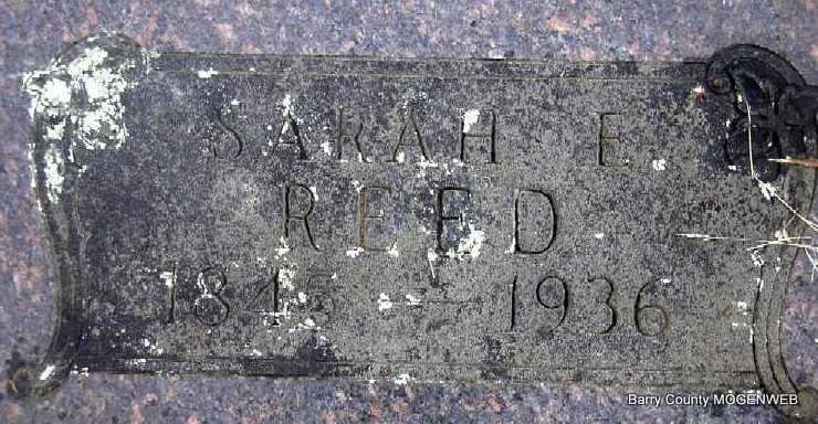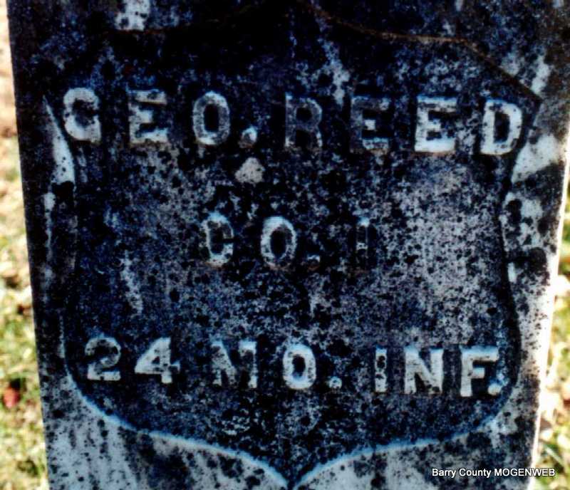 Research Note: All that is on his stone is Co I, 24th MO Inf. (Civil War). According to his death certificate, George Reed was a son of Alfred Reed, born KY. His mother's maiden name was given as Phillips, born in SC. (Son of Alfred Reed and Mary Frances (Phillip) Reed.) Sary Reed was given as his wife's name. Darla's Note: George C. Reed was 1st married to Narcissus M. West and their children: James "Wesley", Ellis, John H., Joseph Alfred, Sarah Caroline, Amos, Williams S., and Thomas. Narcissus (West) Reed is buried in the Haddock Cemetery near Eagle Rock. George married 2nd to Sarah Elizabeth (Garrett) Ball and their children were Mary Frances, Rachel Louise, and Martha. George was a JP in the Roaring River Township. George and Sarah moved from Eagle Rock to Seligman, MO in 1913. - George C. Reed was living in Barry Co., MO by 1850 and by 1860 he was living in White River, Barry Co., MO, where he entered the Civil War at the age of 19 yrs sometime around Oct. - Nov. 1861, enlisting in the Union Forces, Company "I", the 24th Missouri Infantry Regiment. - Photo of George and Sarah | Death Certificate Donna Cooper Photo Darla Ball Marbut |