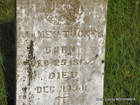 Dec. 9, 1901 | Research Note: Born in Wythe Co., VA, married Catharine Bradley in Montgomery, IL June 6, 1836 (marriage record). Pvt Co H and Co B, 24th Reg't Inf. Vols, Civil War. James Tucker's parents were Robert Tucker, Sr. and his wife Mary Pierman. James and Catharine (Bradley) Tucker's children were: Sarah Jane Tucker who was married 4 times in this order, John Middleton Smith, Abraham M. Lewis, Joseph Henry Hill, Frank Morrison; Richard Tucker; Mary (Mrs. Shadrick Bendego Johnson); James Tucker; Cynthia (Mrs. Jasper M. Smith); William Tucker; Francis Marian Tucker; Marada Catherine Tucker (Mrs. Edward Stevenson Wallen); Eliza Catherine Tucker (Mrs. W. Martin Simmons). - Tucker Family History | Headstone Mary Homesley Note Photo Darla Ball Marbut |