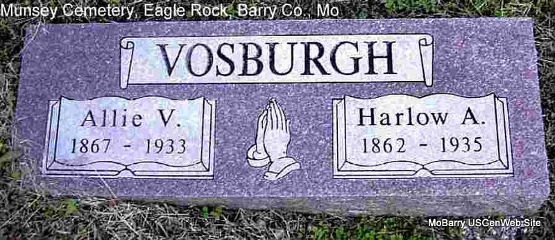SSW: Harlow A. Vosburgh - Research Note: Daughter of Amos T. Bishop and Abigail Runnels. Death certificate indexed as Vosburgh. Parents not named. Harlow A. Vosburgh of Eagle Rock, MO was the informant. - Allie married Harlow Abram Vosburgh and their children were Della Vosburgh, Harlow Avern Vosburgh, Azelia Vosburgh, Bernice Vosburgh (Mrs. Lee West), and Warren Vosburgh. | Census Death Certificate Phyllis Long Photo Darla Ball Marbut |