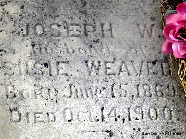 Inscription: "Husband of Susie Weaver" - Research Note: Son of John Newton Weaver and Violet Louisa Pringle. Joseph Weaver married Susan Neeley on May 24, 1895 in Barry Co., MO. William F. Speer married Susan Weaver on June 30, 1901 in Barry Co., MO. Susie is buried at Horner Cemetery, died in 1952. -1900 Census, Flat Creek Township, Barry Co., MO - Joseph Weaver, born in Ky in 1869; Susie Weaver, March 1868 born in MO; Elga O. Weaver, Feb. 1896, MO and Eli M. Weaver born Nov. 1897 in MO. | MO Marriage Records Phyllis Long Census Photo Darla Ball Marbut |